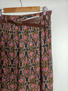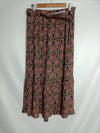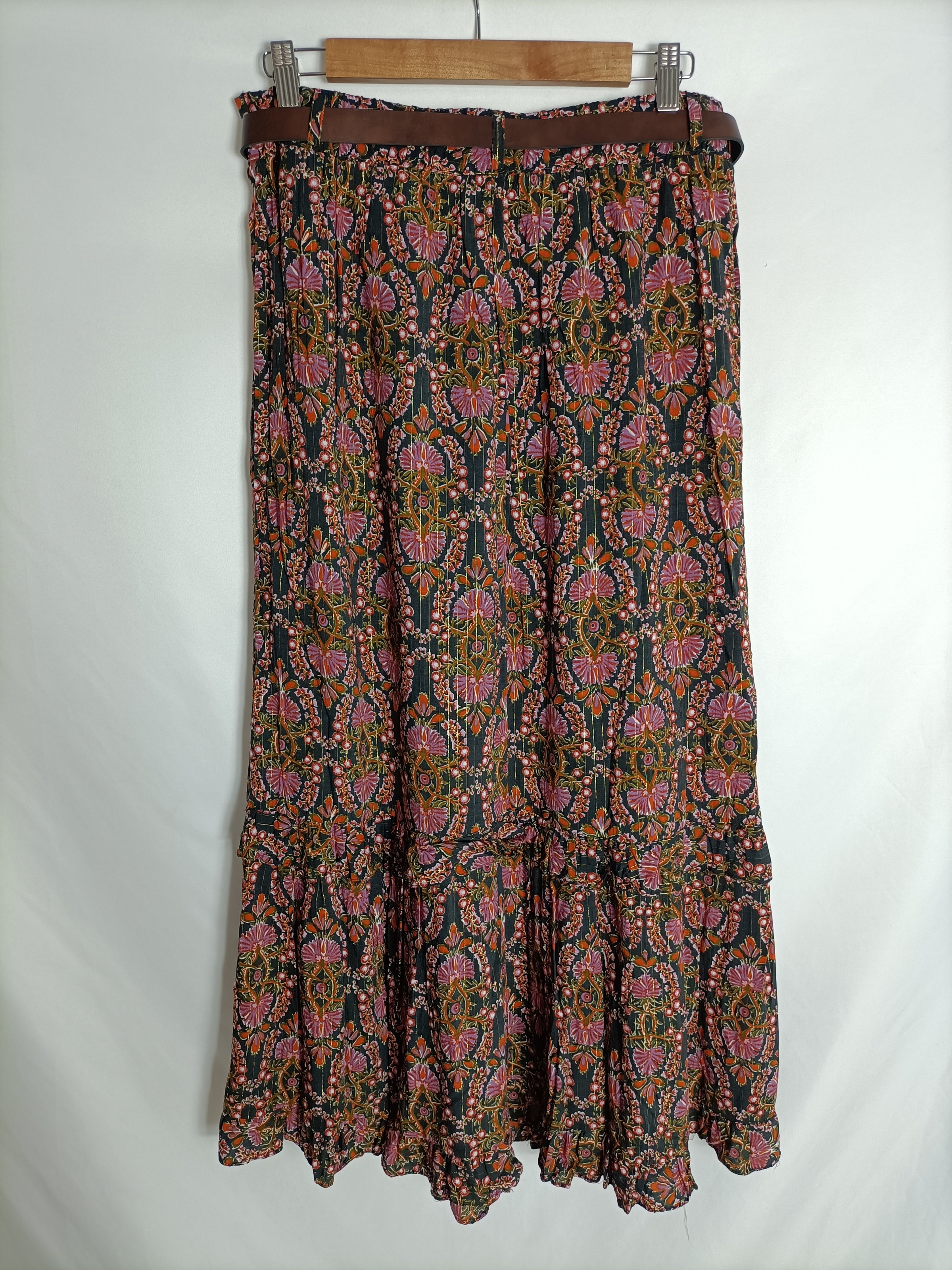 falda midi negra con estampado de flores y detalle de rayas con hilos metálicos dorados. Cintura elástica con cinturón.