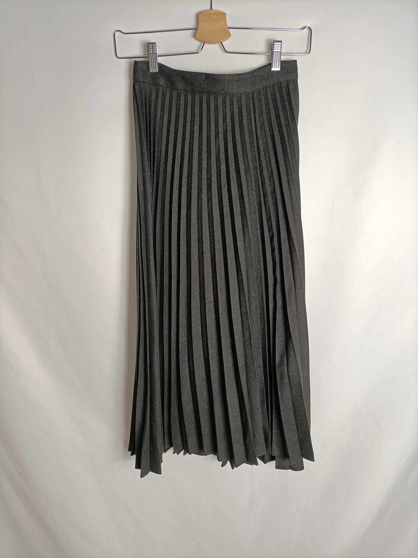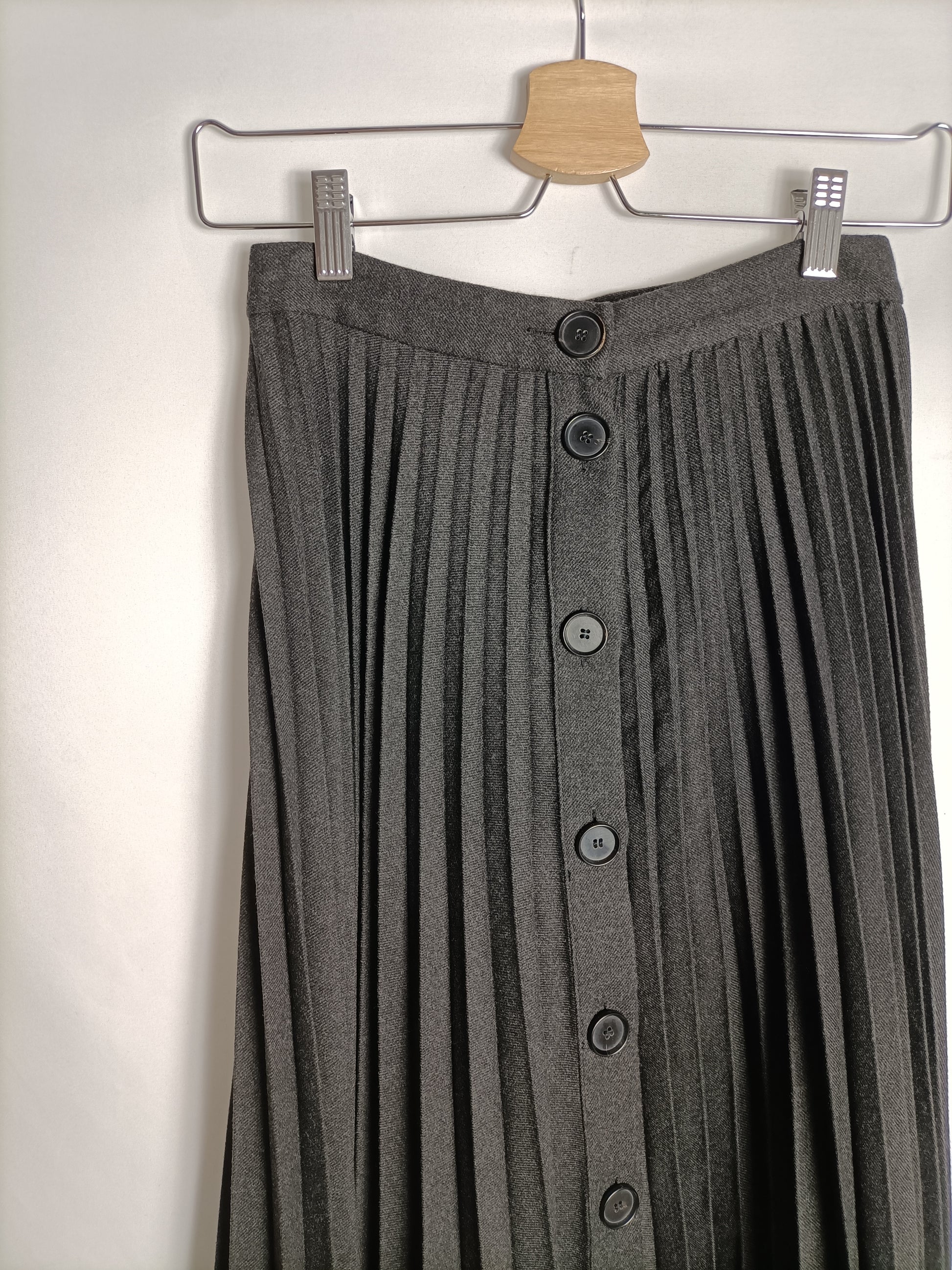falda midi gris plisada con botones. no elástica. cintura 32 cm
