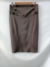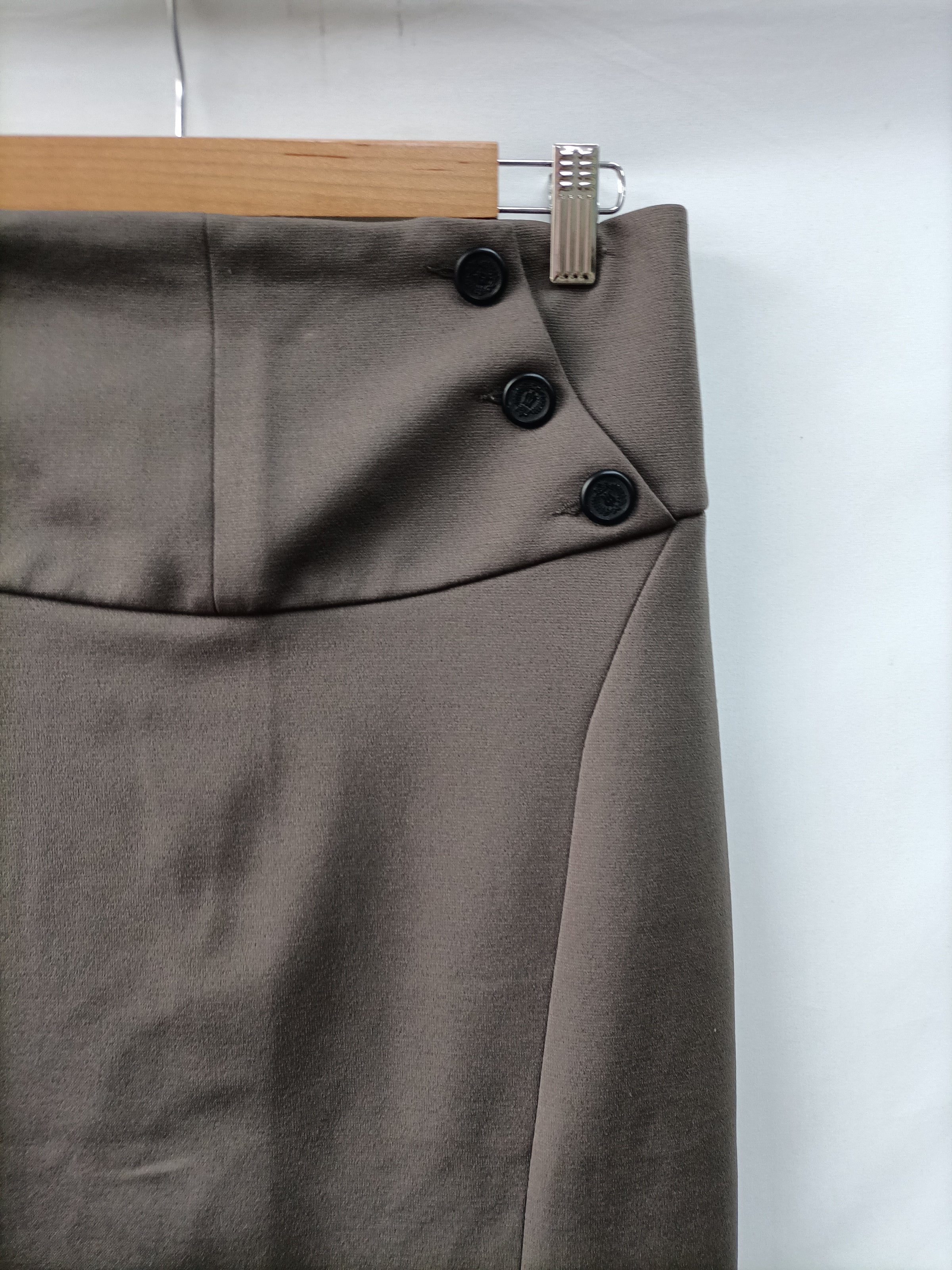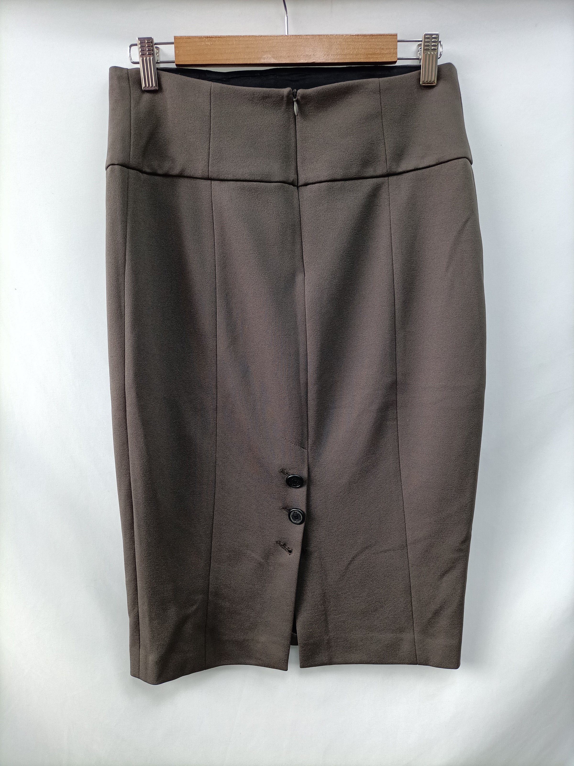 Falda verde caqui con detalle de botones. Tejido de elástico. Tara. Le falda un botón de la espalda parte de abajo. Cintura 38 cm largo 65 cm