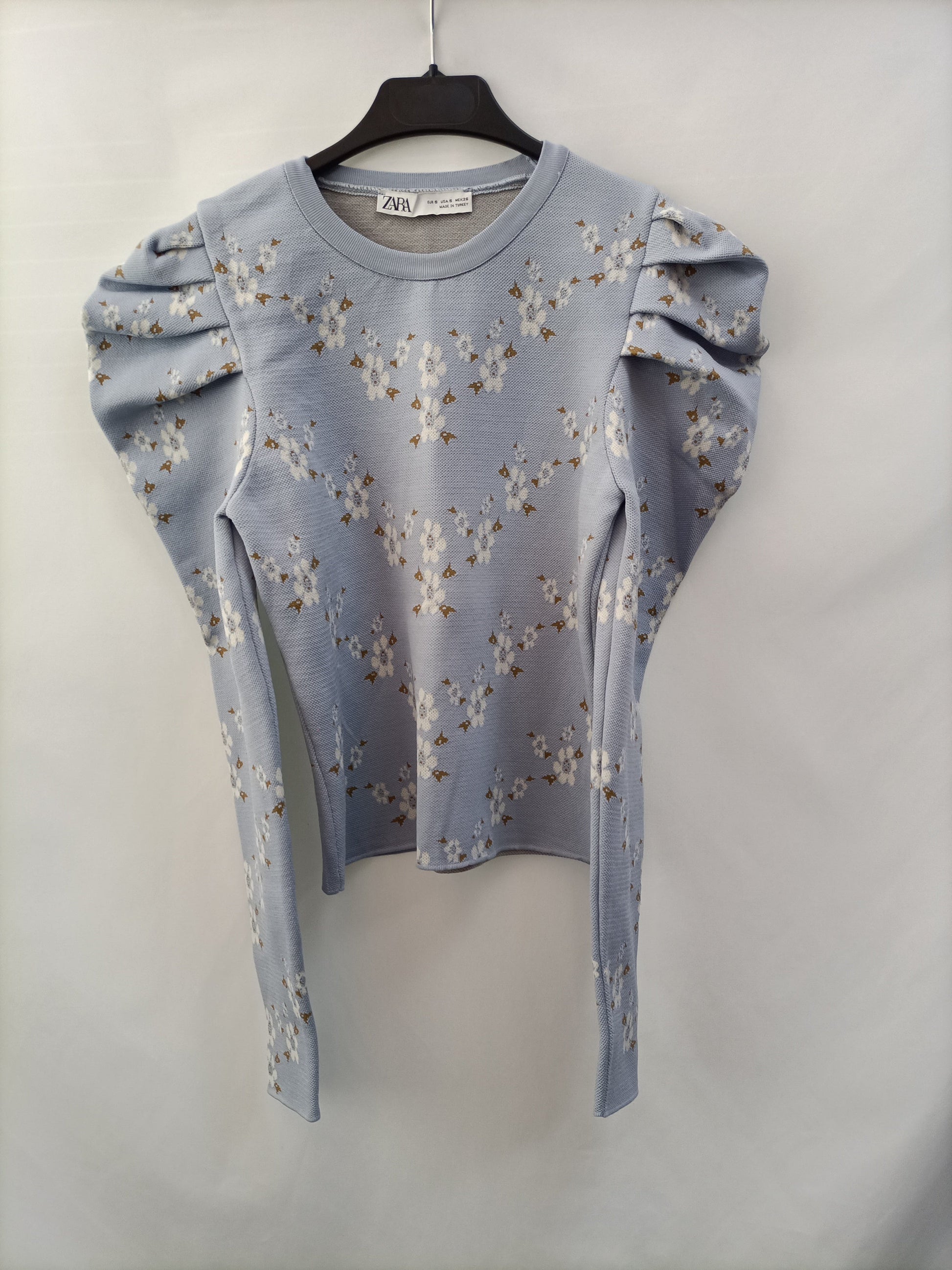 jersey de punto azul elastico flores. Hombros abullonados. Largo 49 cm
