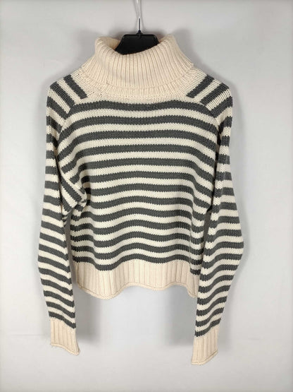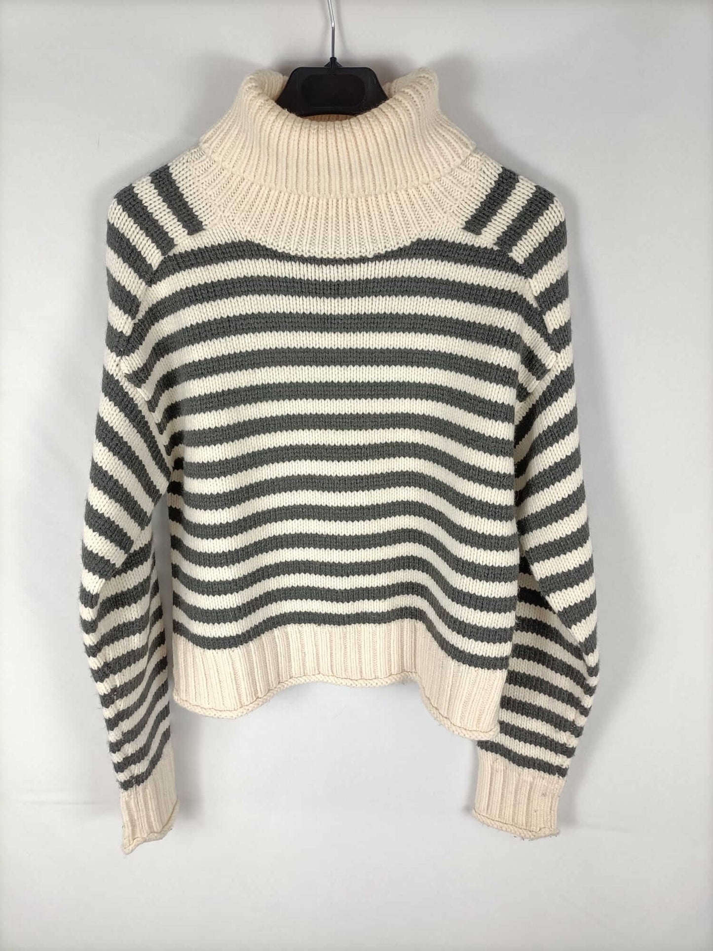 Zara. Jersey de rayas beige y gris gordito con el cielo alto. Cortito. Largo 61 cm