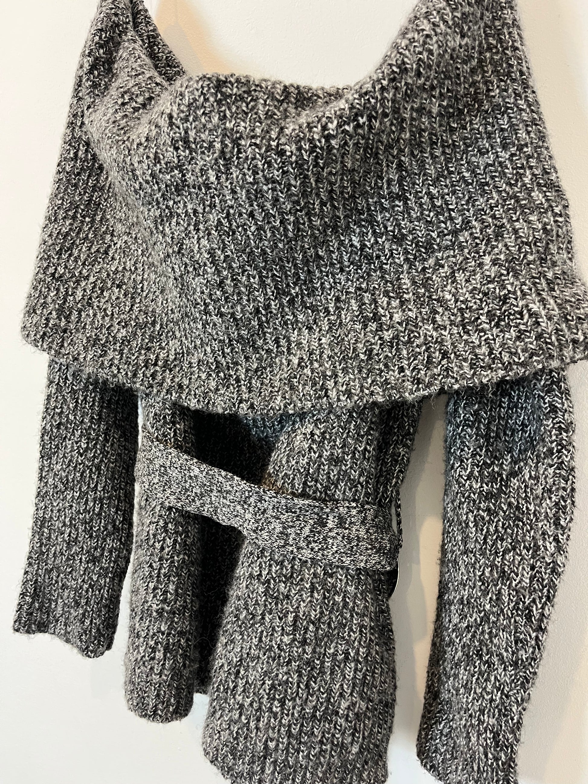 Jersey gris y blanco de espiga con el cuello barco con detalle de cinturón.