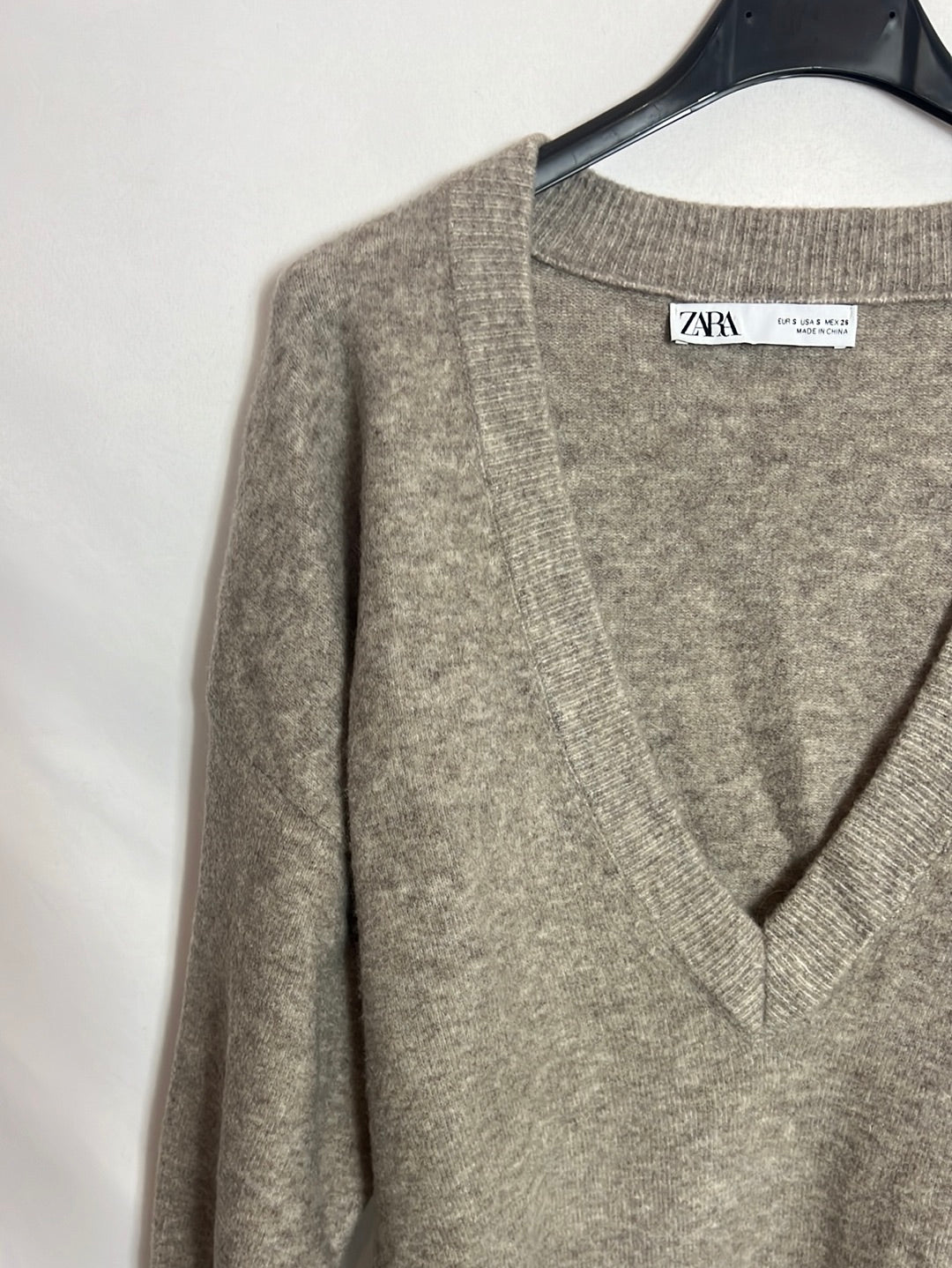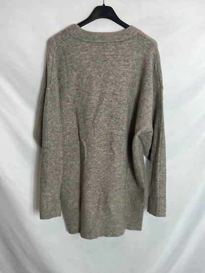 jersey largo beige con el cuello en pico pronunciado. largo 77cm