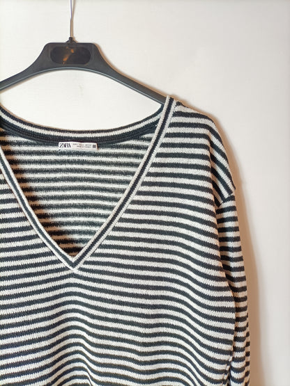 Jersey de rayas negro y blanco de punto de verano con escote pico.