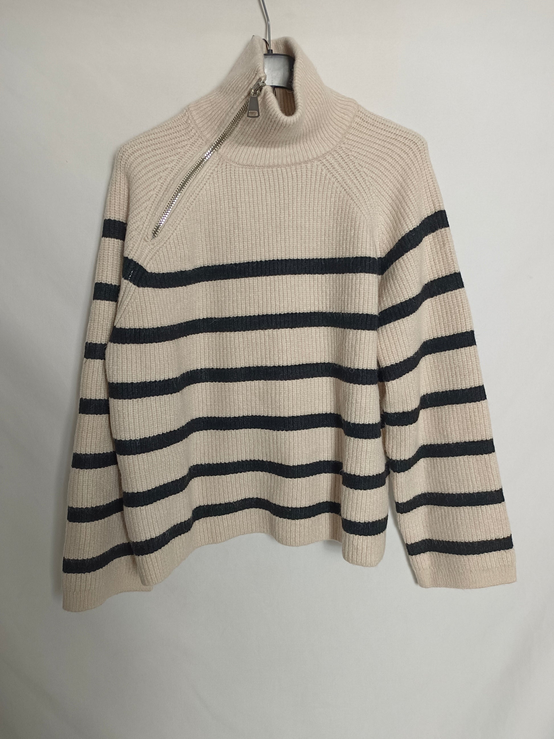 NUEVO CON ETIQUETA. Jersey beige y azul de rayas con cremallera lateral en el cuello