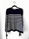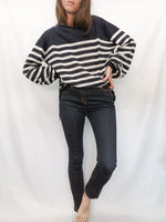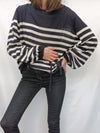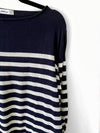 Jersey de punto con rayas azules y blancas es grandecito y en las mangas tiene elástico que se ajusta.
