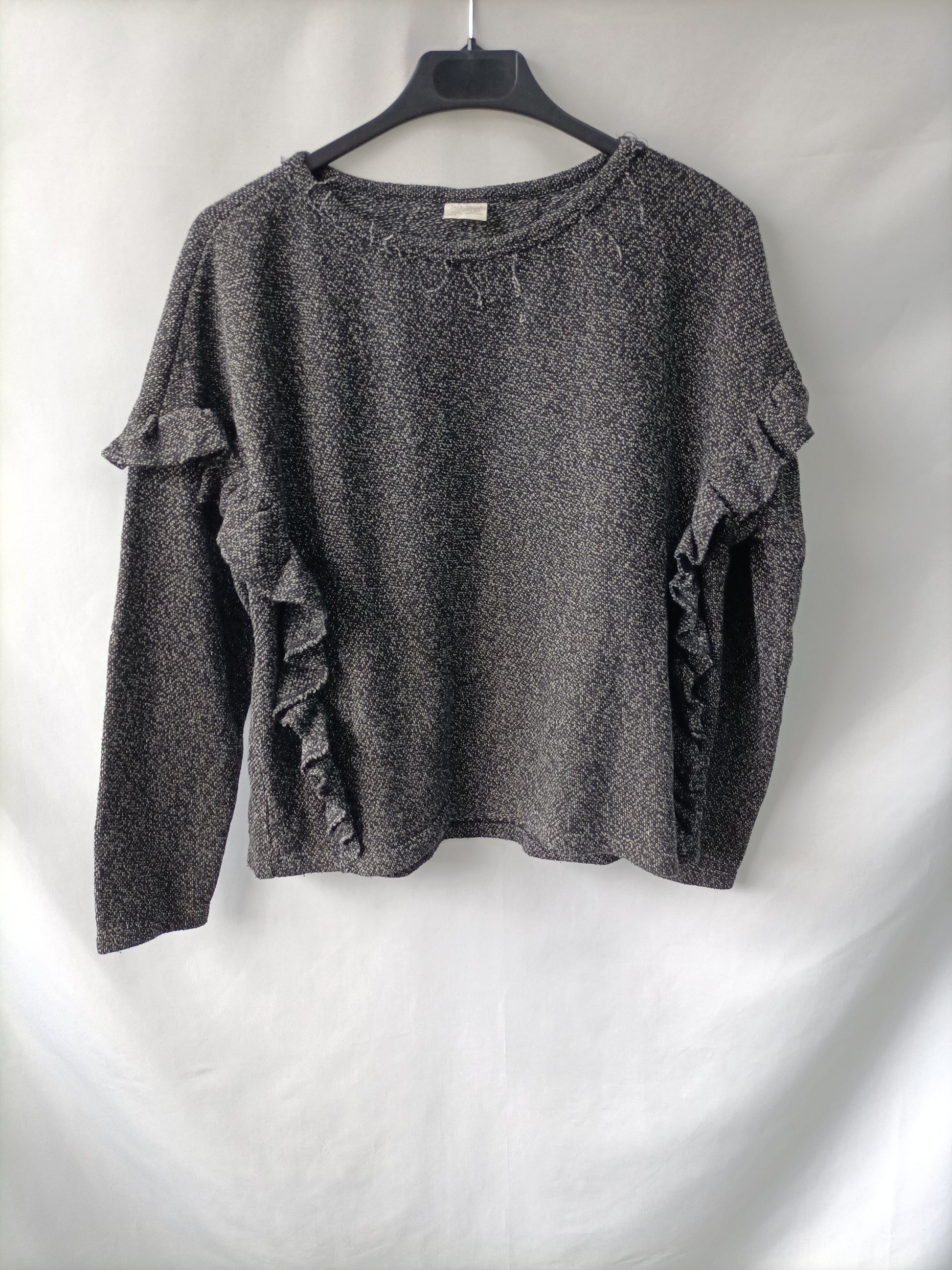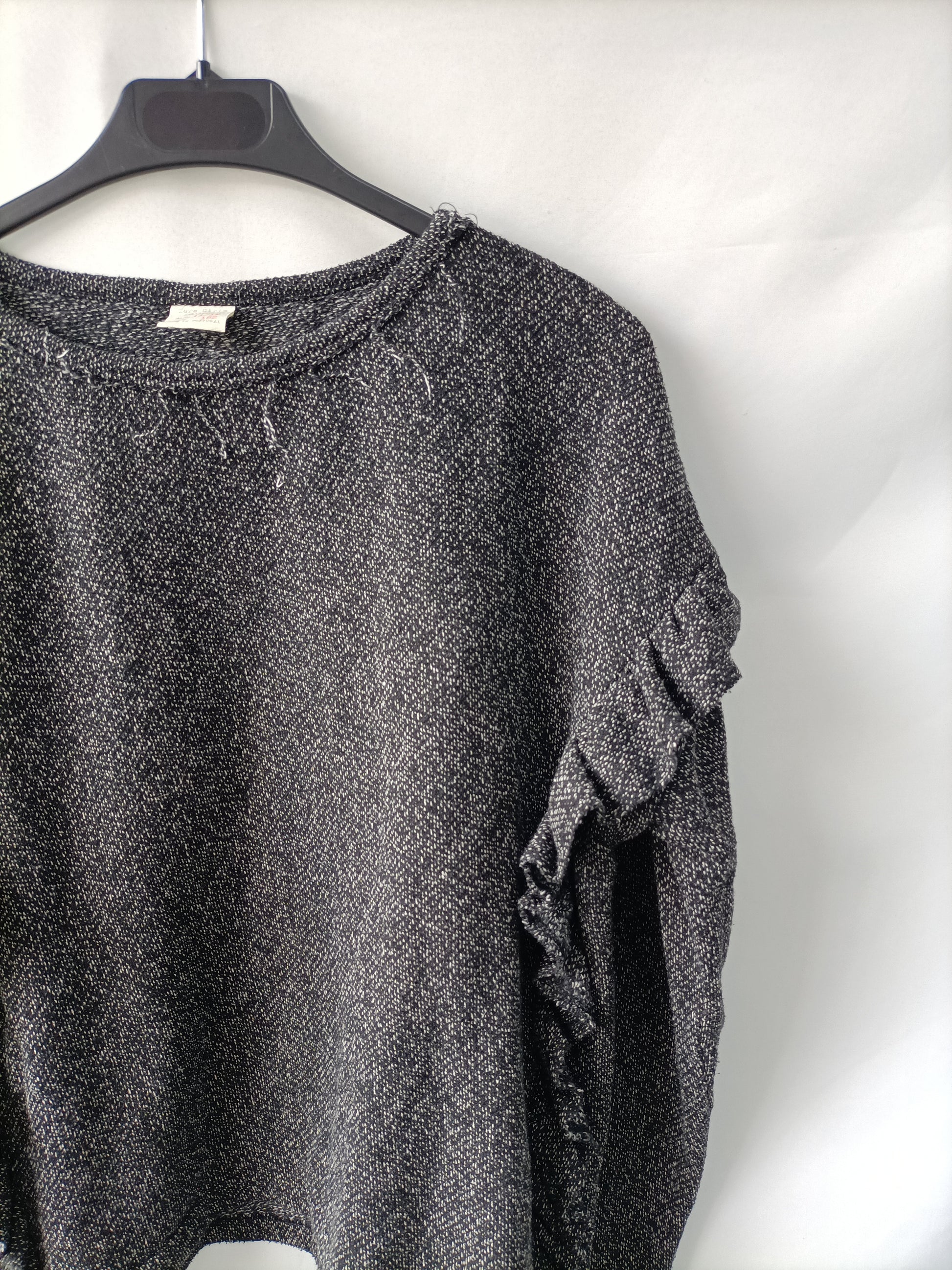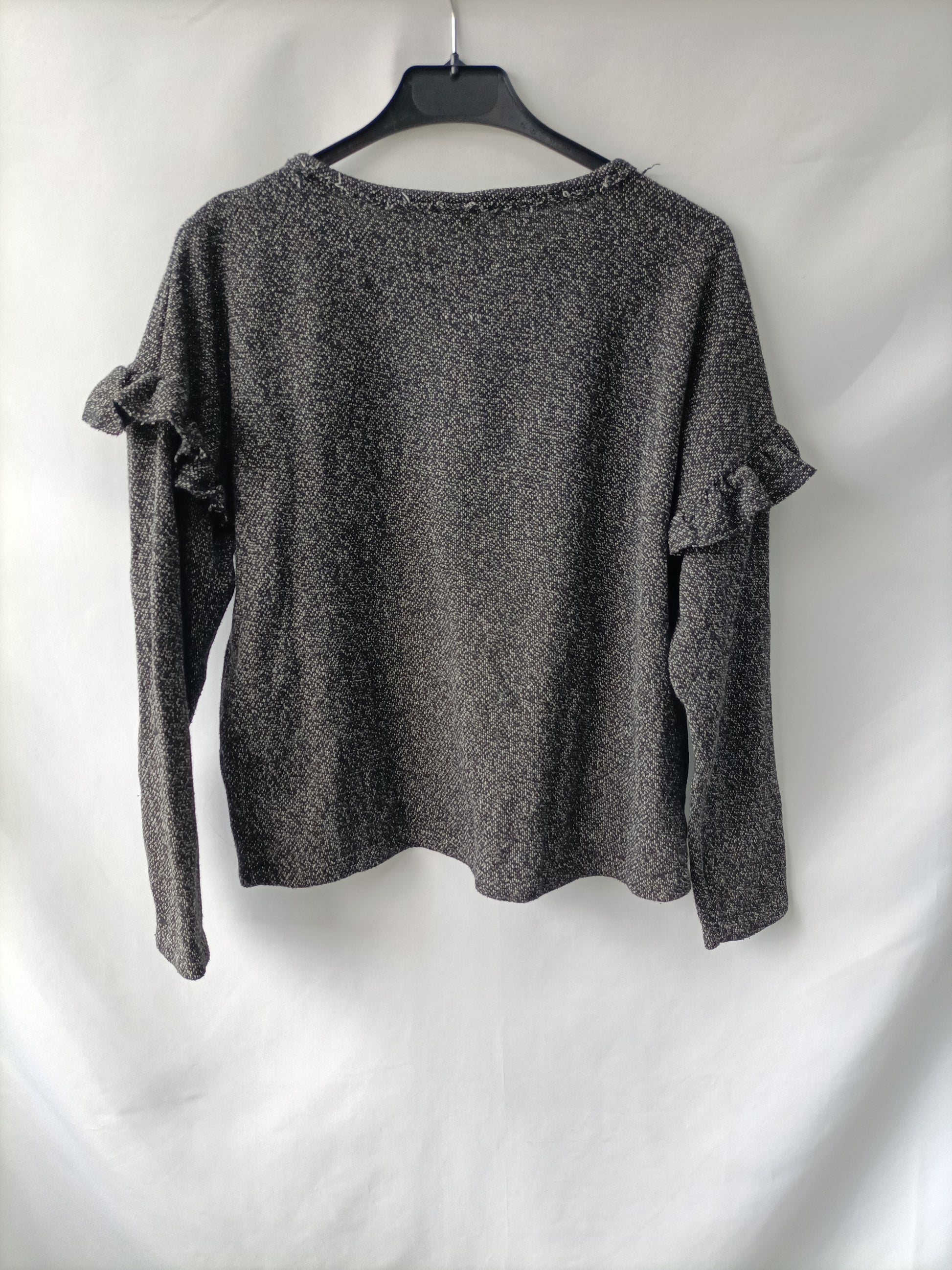 Zara kids. Jersey jaspeados negros y blanco con volantes en las mangas y cuello deshilachado. Elástico. Largo 53 cm