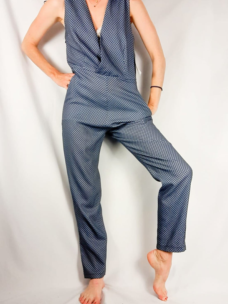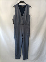 NUEVO CON ETIQUETA. Mono fluido con escote en pico cruzado. De sisa a sisa 47 cm, cintura 39 cm, cadera 47 cm, largo de hombro a tiro 79 cm, largo 143 cm