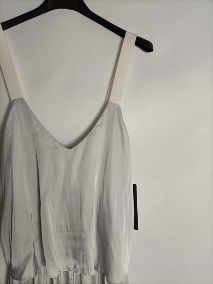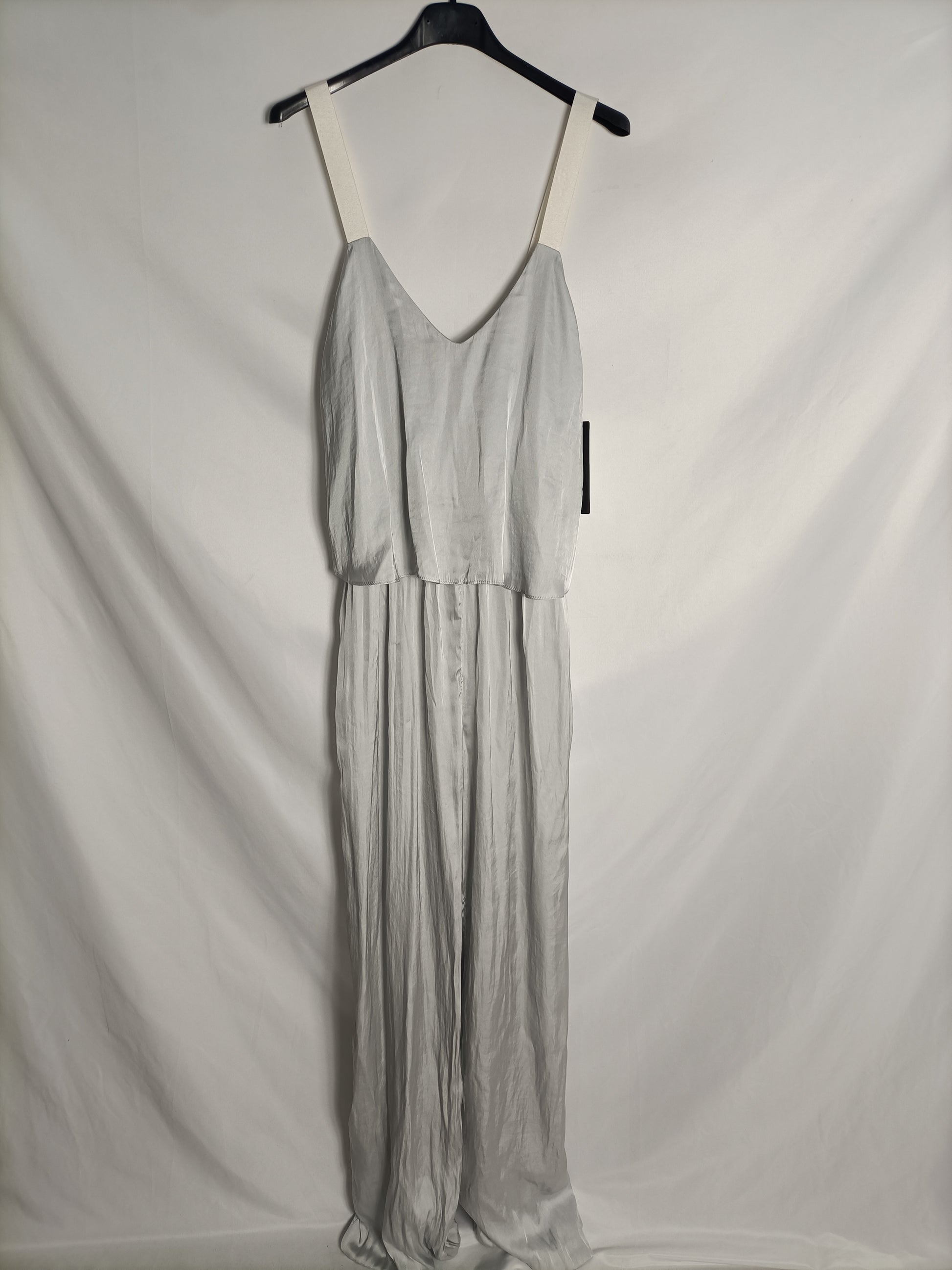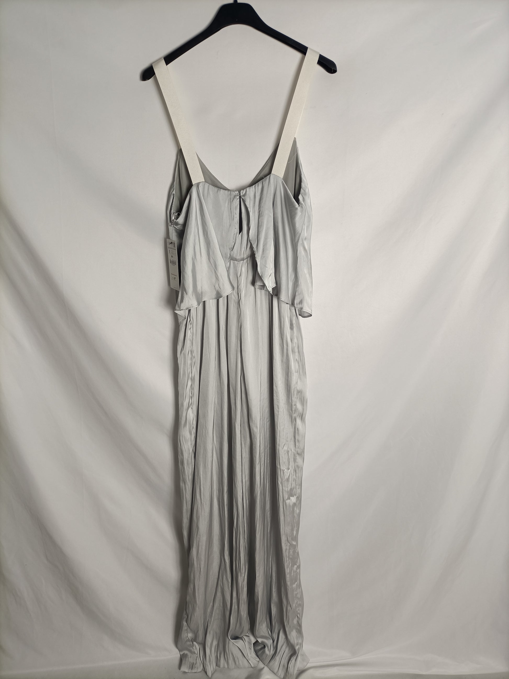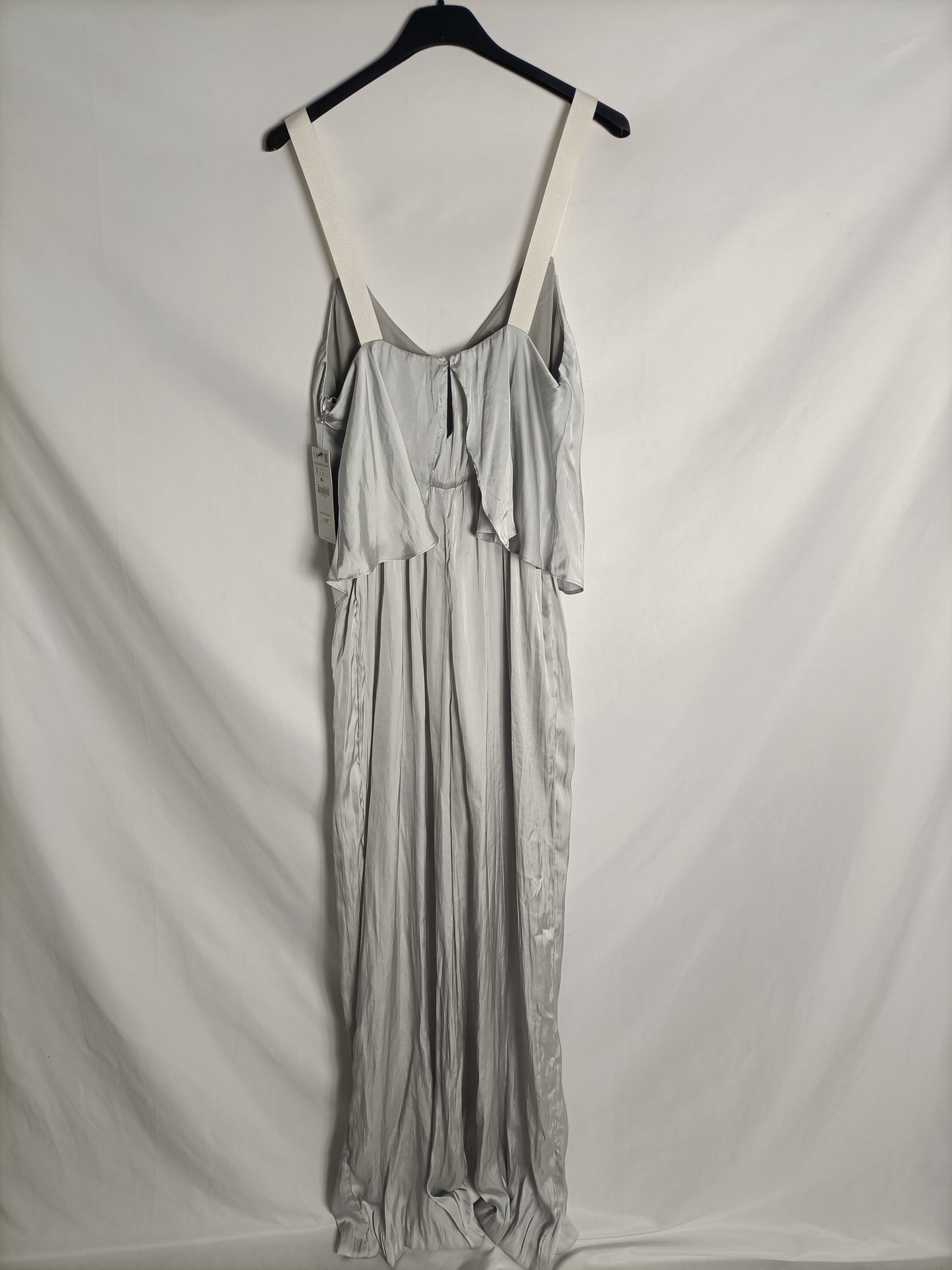 NUEVO CON ETIQUETA. Mono palazzo gris perla fruido de tirantes.