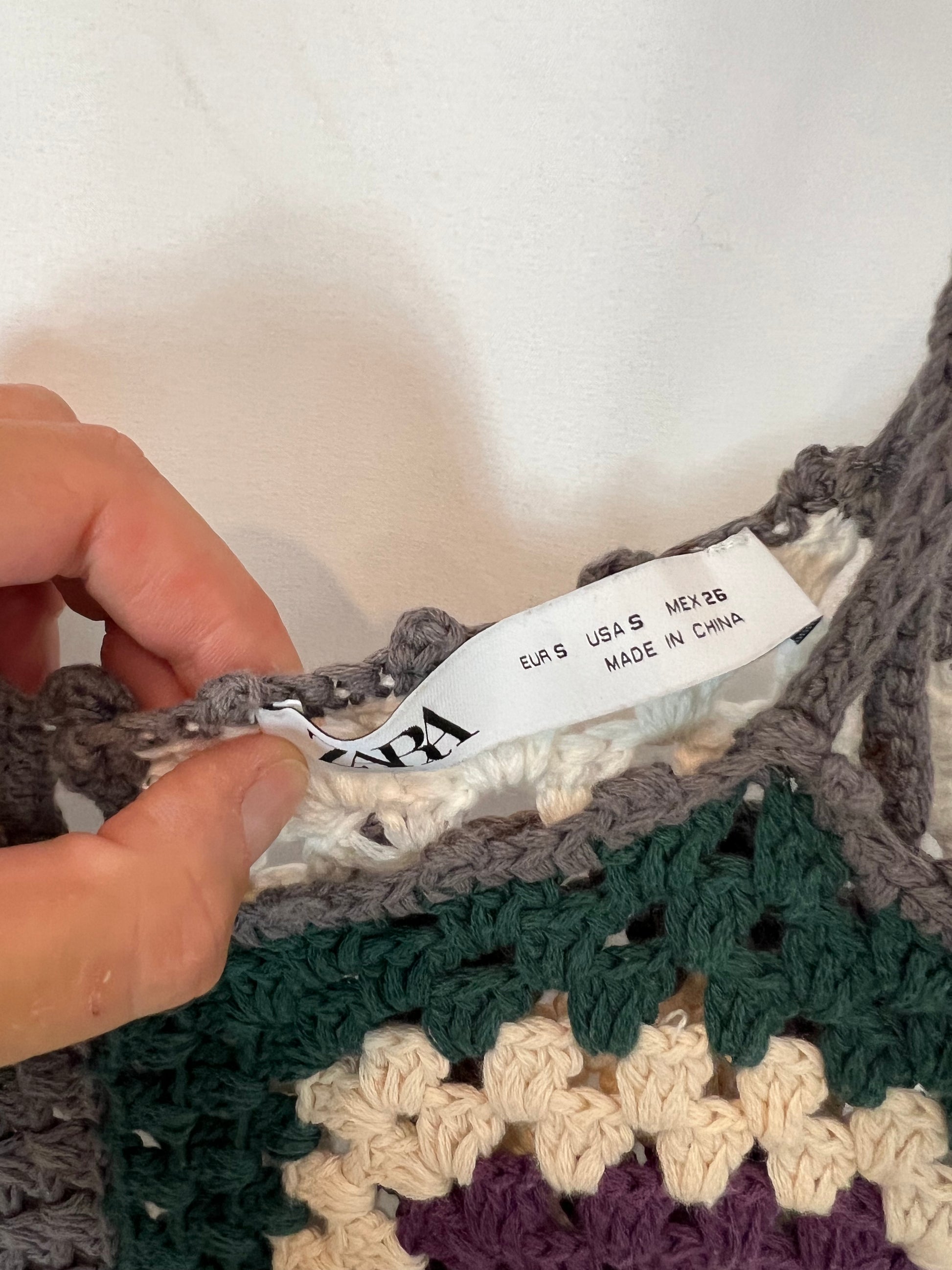 Mono largo lino y crochet en algodón colores. De sisa a sisa 41cm, largo 53cm
