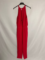 Mono largo rojo fluido con corte en la cintura y escote halter.