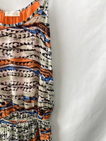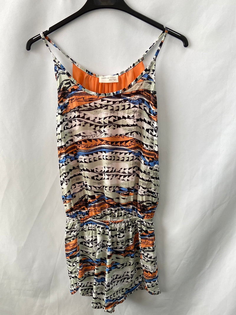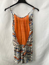 Mono corto con estampado tipo étnico con la espalda naranja semitransparente, la cintura es elástica. Largo 76 cm