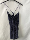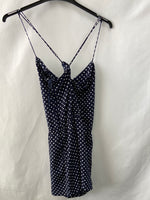 Mono corto azul con lunares blancos. Los tirantes son finitos y cruzados por la espalda. Tiene cremallera lateral.