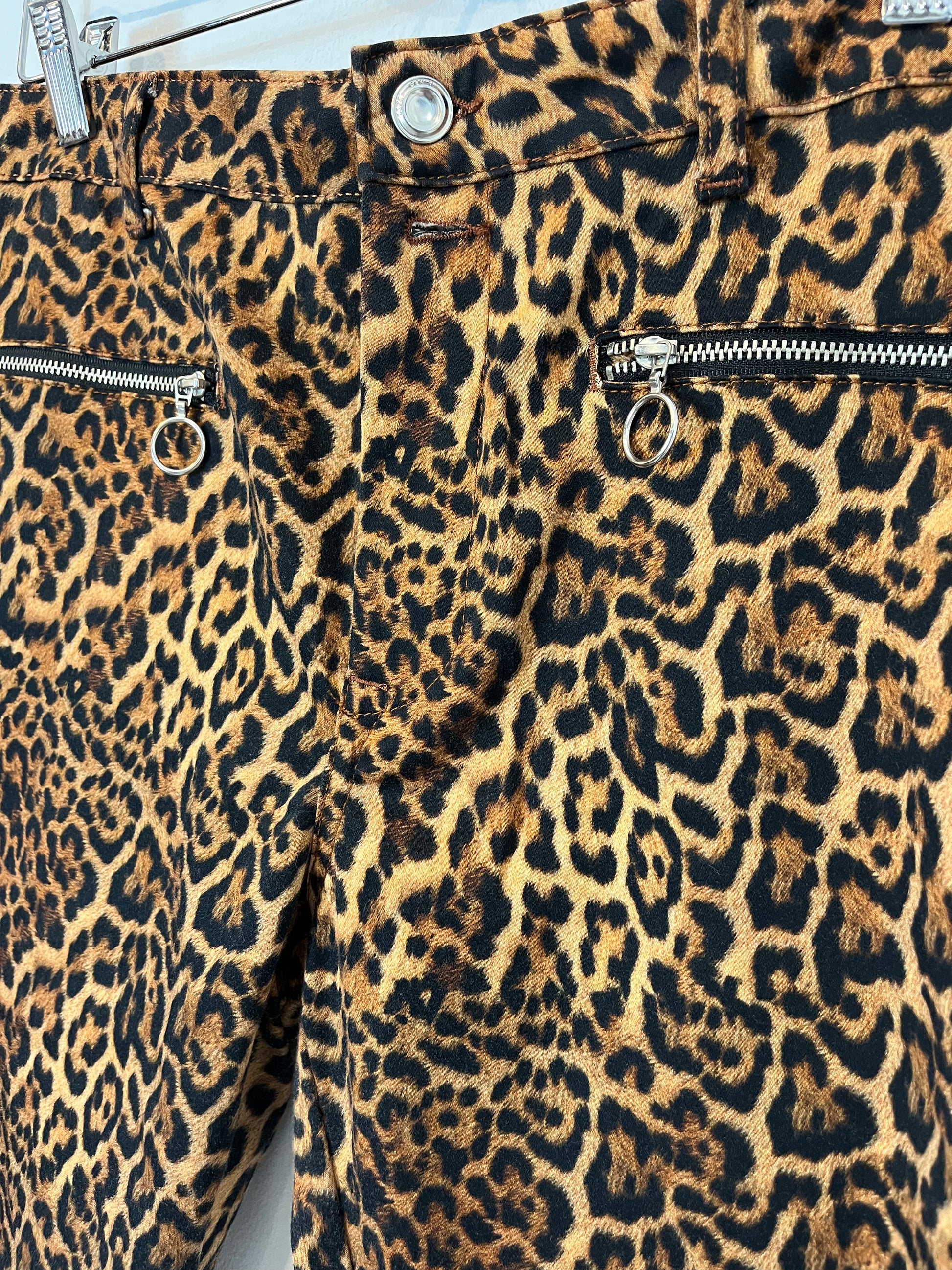 Pantalón animal print cremalleras. Cintura 38 cm, Largo 91 cm. No elástico