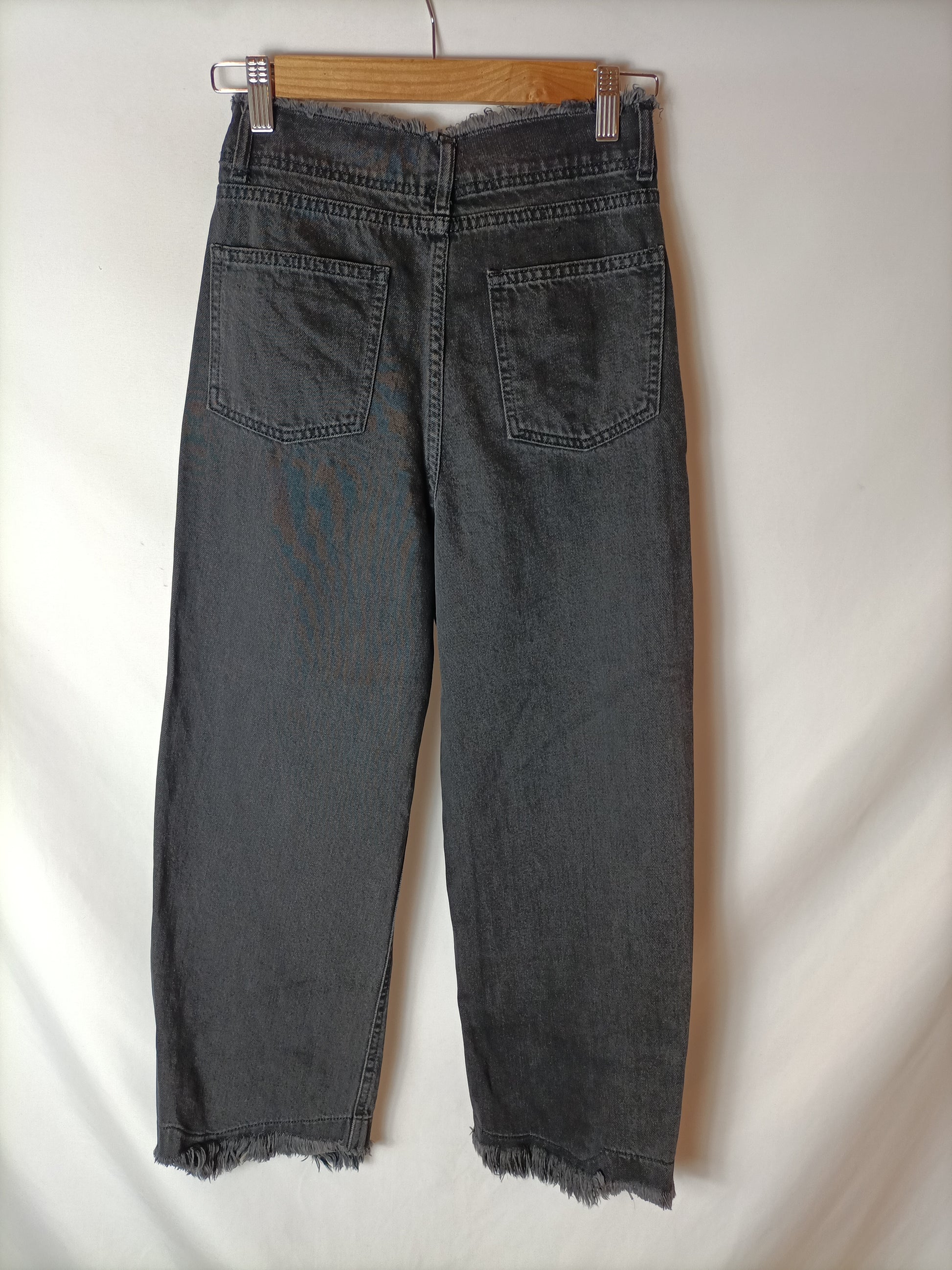 Pantalón denim negro estilo culotte con cintura y parte de abajo deshilachada. cintura 33 cm