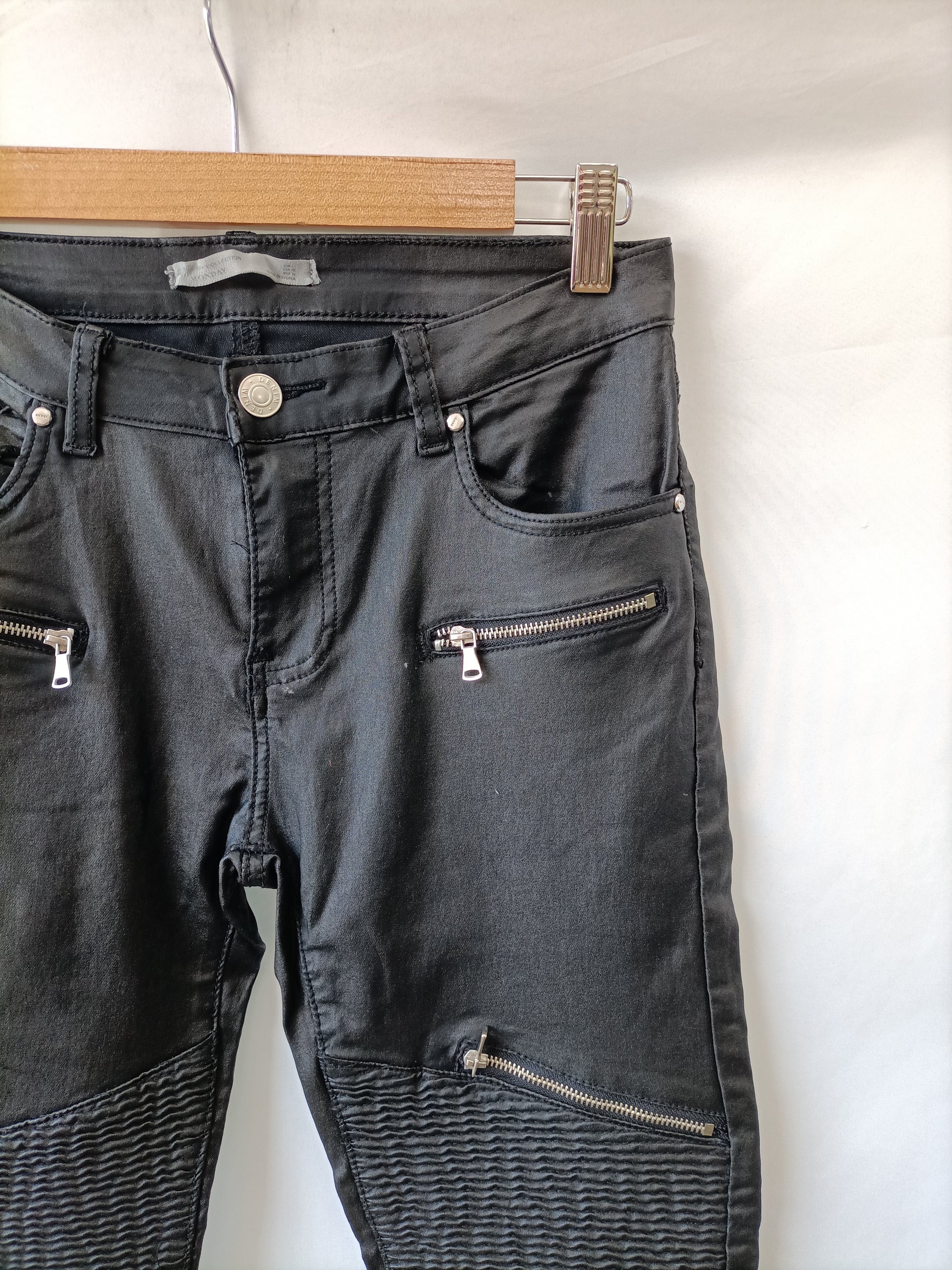 Zara. Pantalón negro encerado con detalles de cremallera y pliegues. Elástico. Cintura 38 cm largo 98 cm