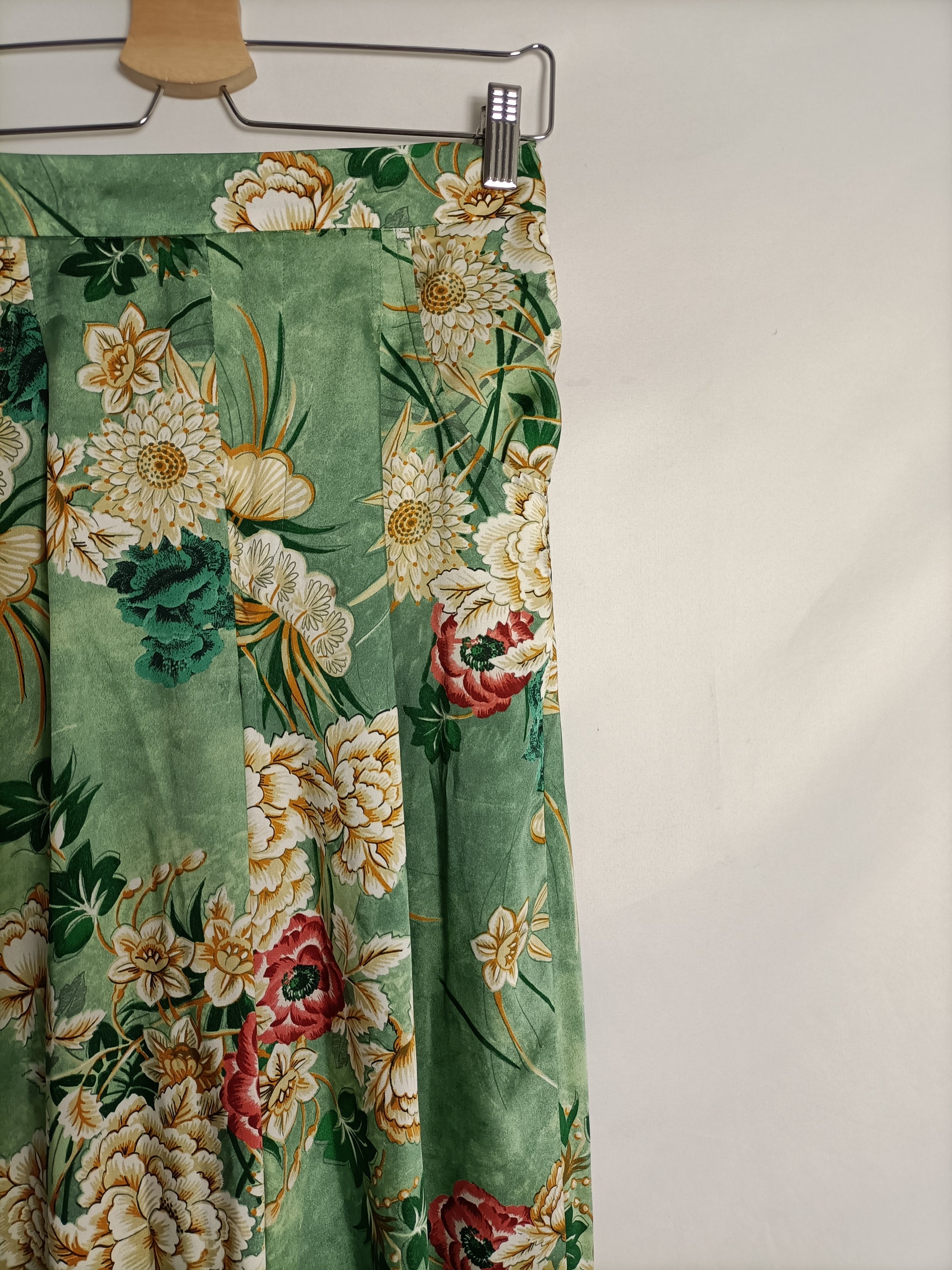 Pantalón fluido verde satinado estampado. Goma elástica en la cintura