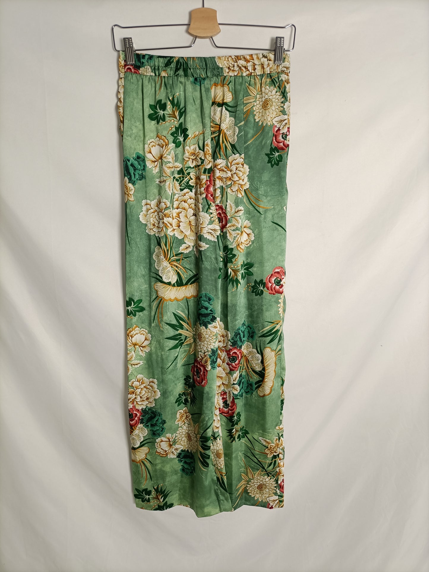 ZARA. Pantalón fluido verde satinado estampado. T XS