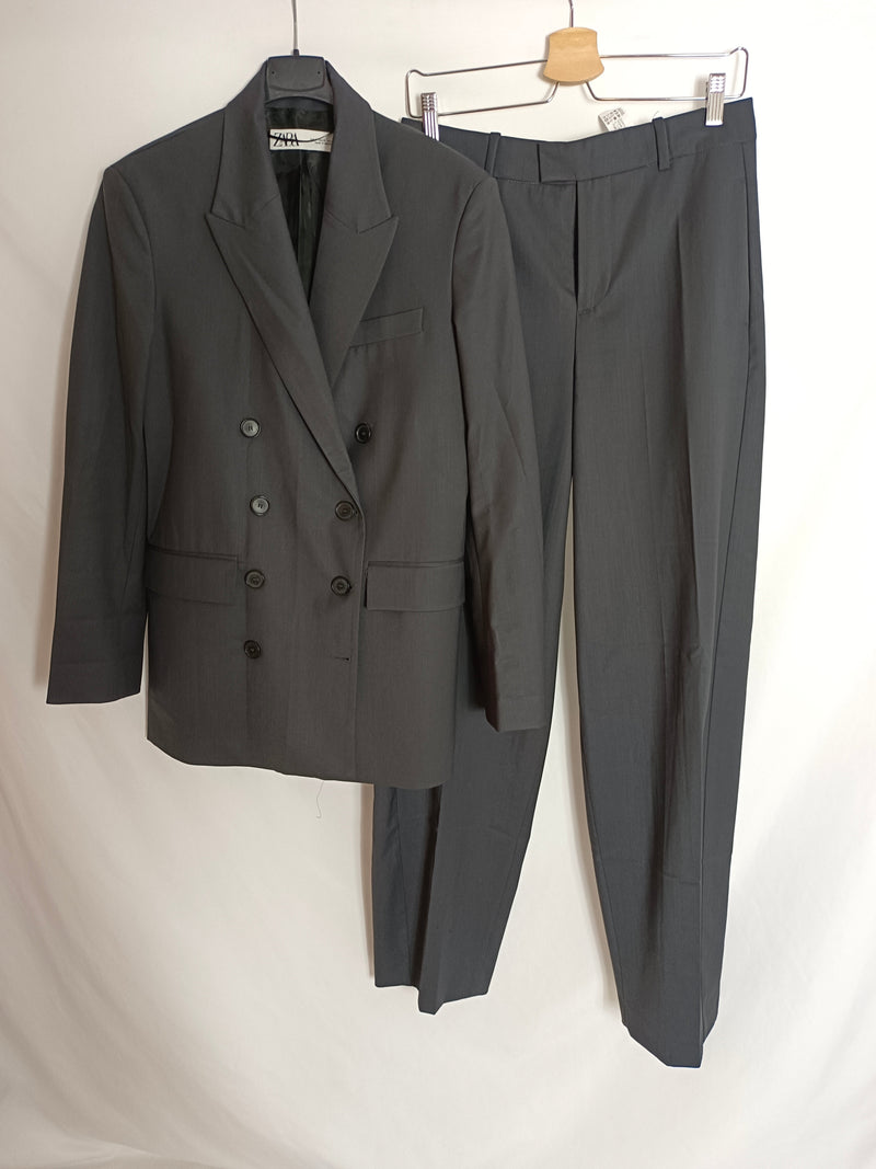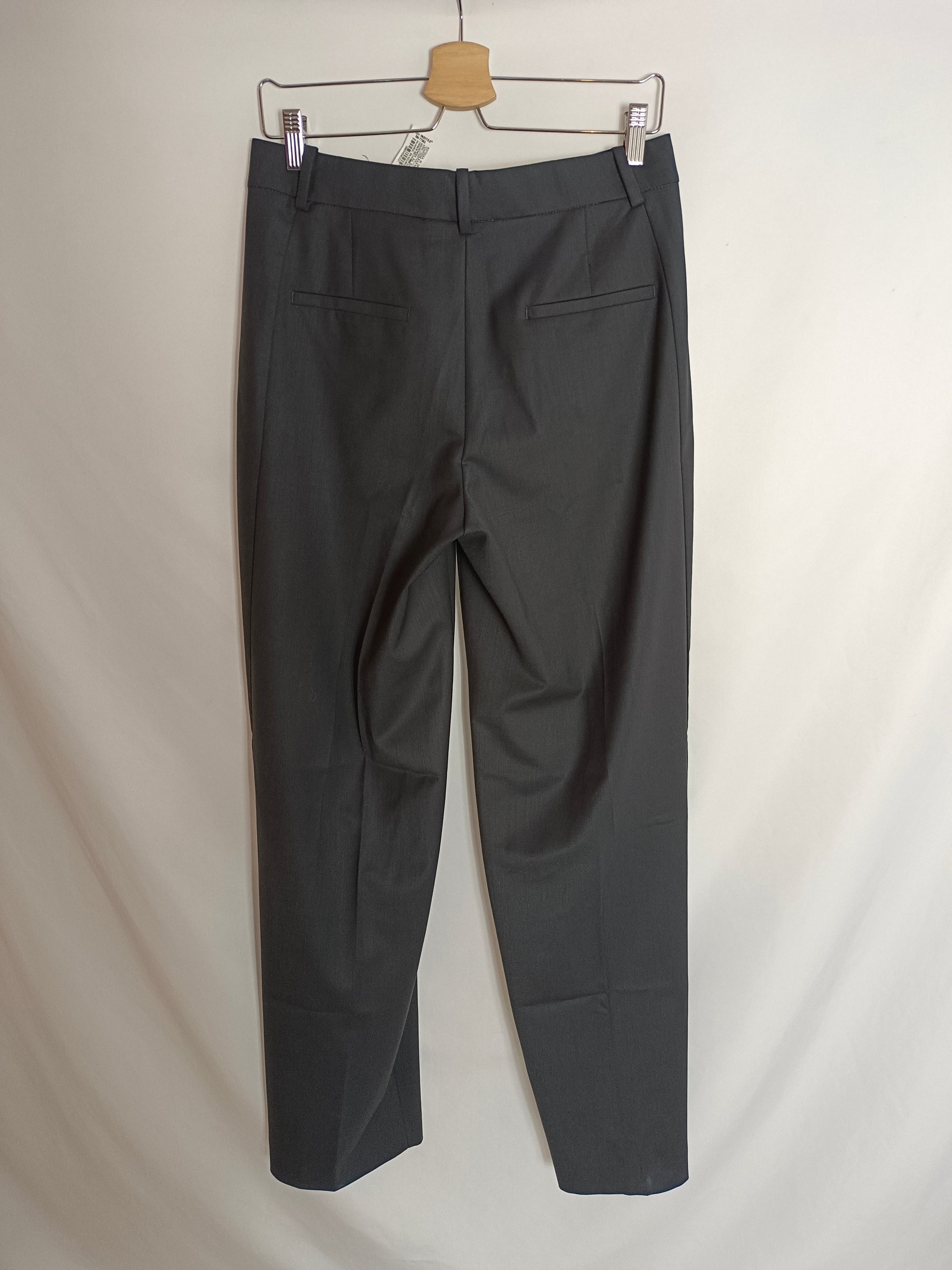 Pantalón fluido gris pinzas, no elástico. total look con blazer
