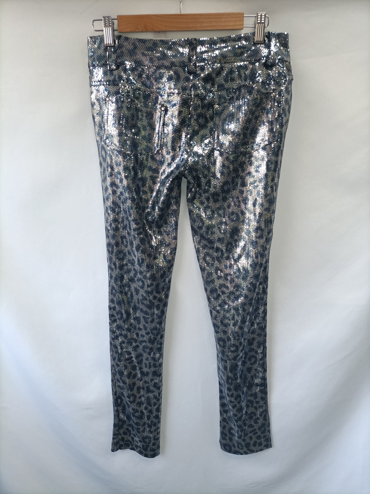 Pantalones pitillo de lentejuelas con estampado animal print. No elásticos.