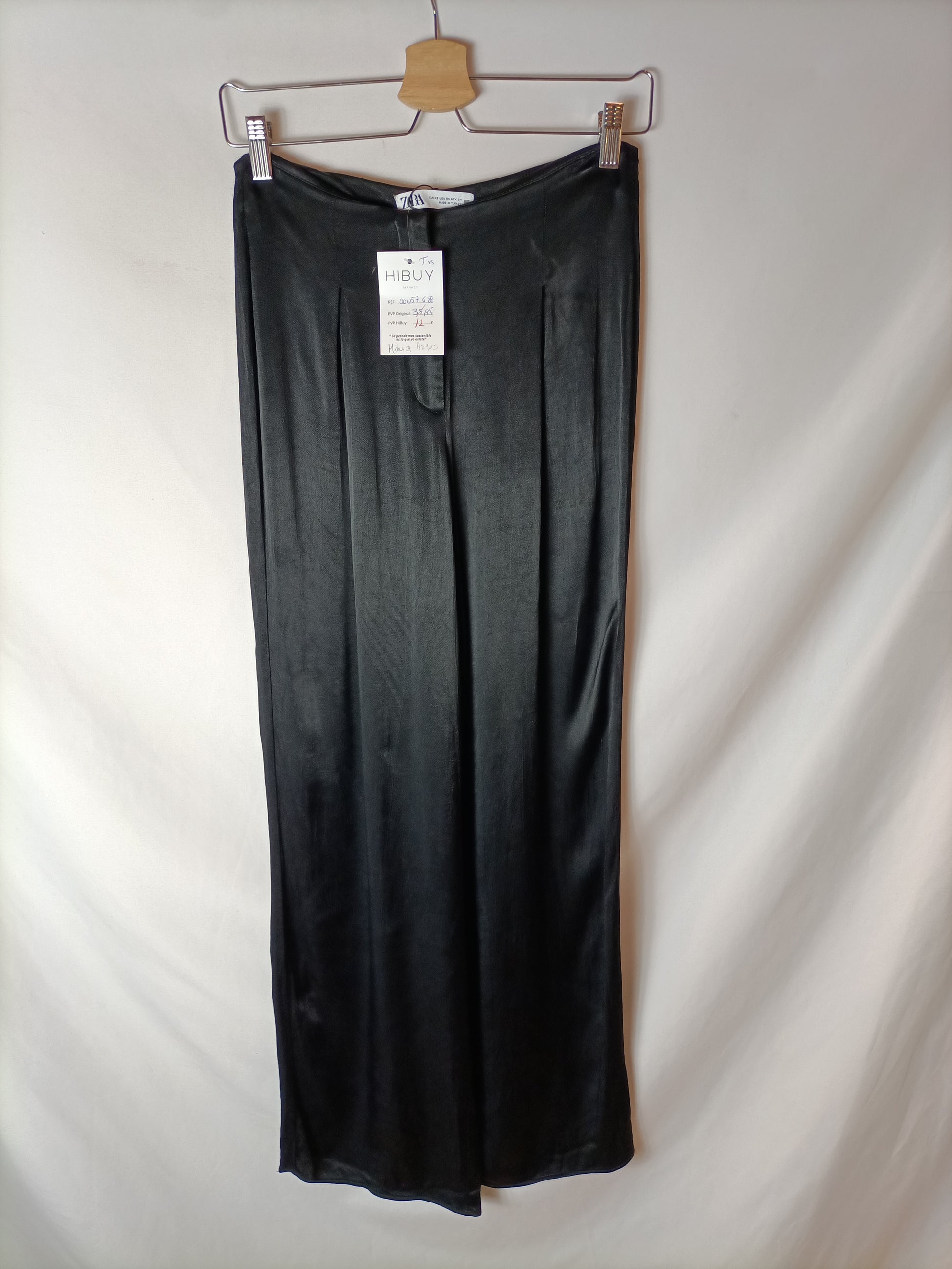 Pantalón negro ancho de tejido satinado con pinzas. Cintura 34 cm