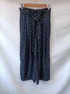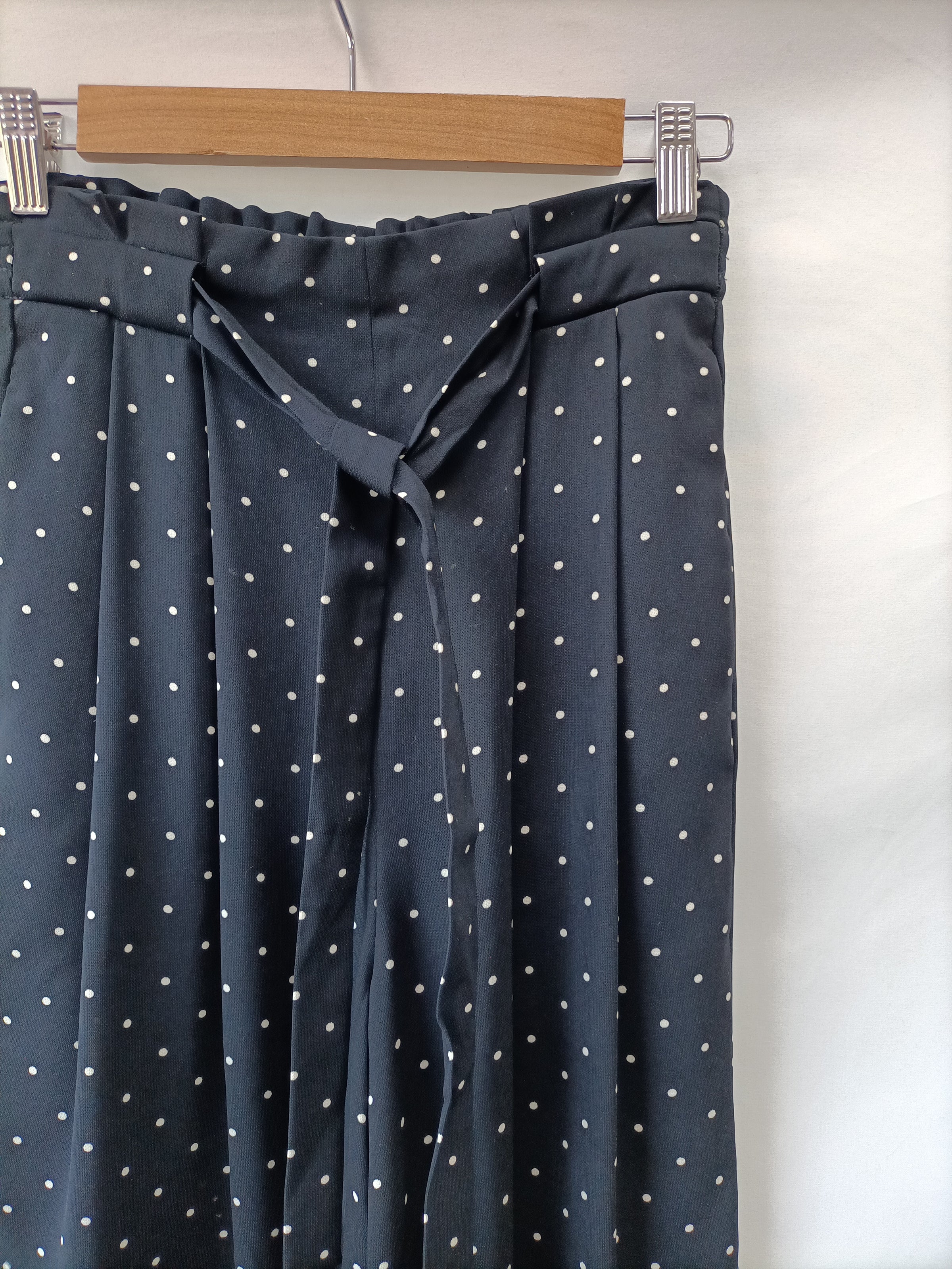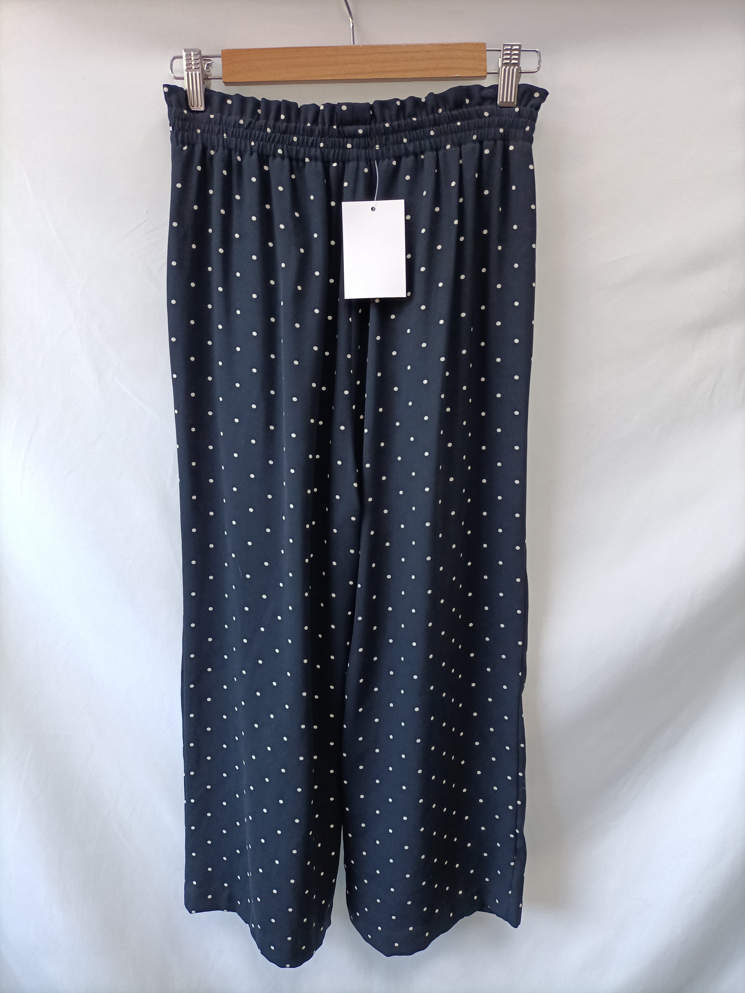 Zara. Xs. Pantalón Palazzo azul marino con lunares. Cintura elástica con lazada. Fluido. Largo 85 cm