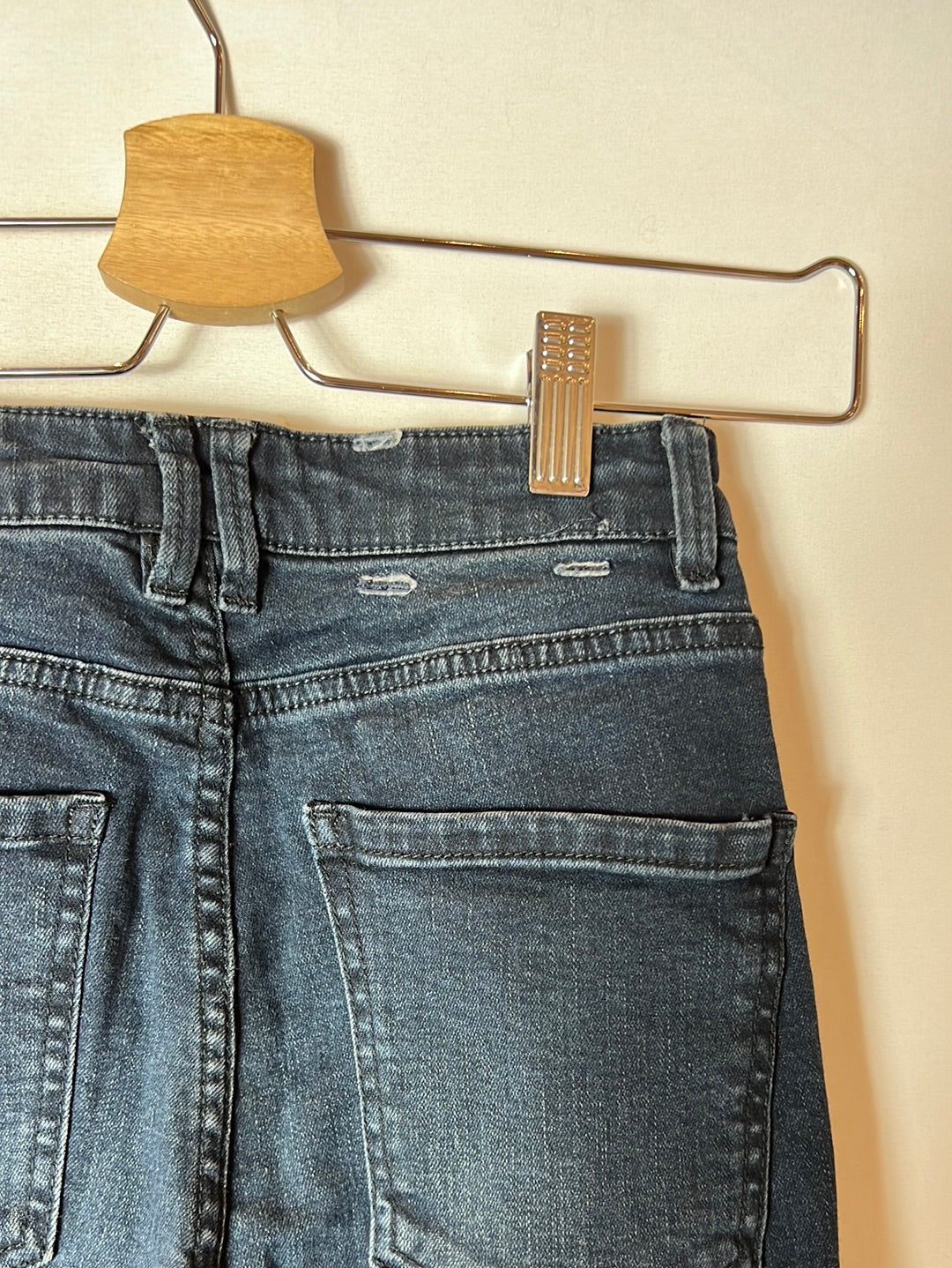 Pantalón denim oscuro muy pitillo con la cintura alta. semirelástico. cintura cm Largo cm. tara: típica chapita trasera cortada
