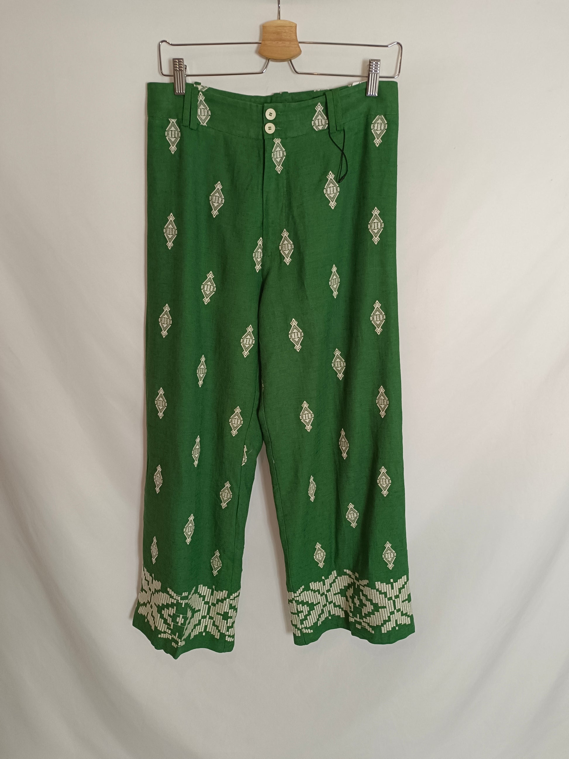 ZARA. Pantalón verde bordado T.m