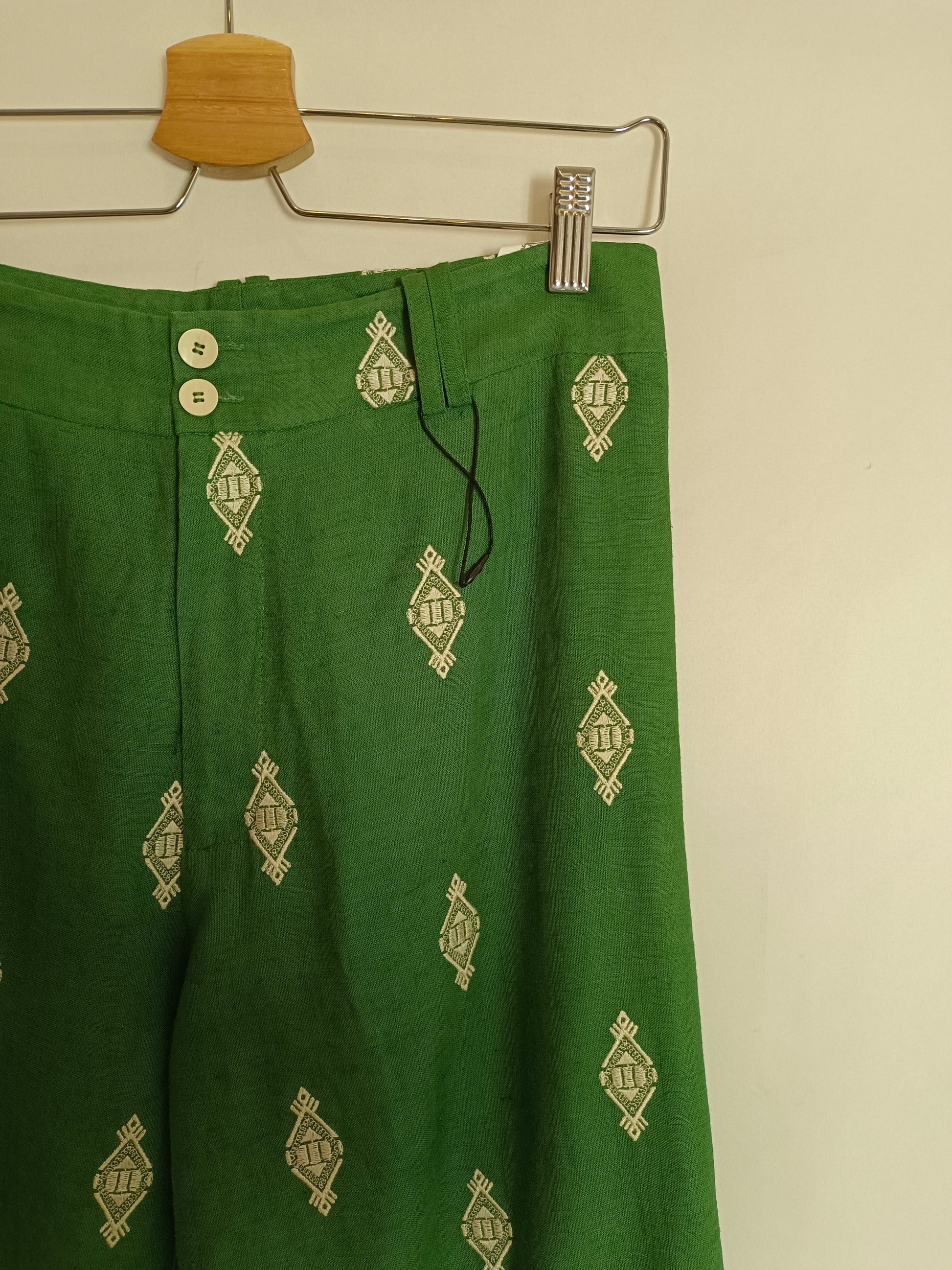 Pantalón verde culotte bordado en blanco.