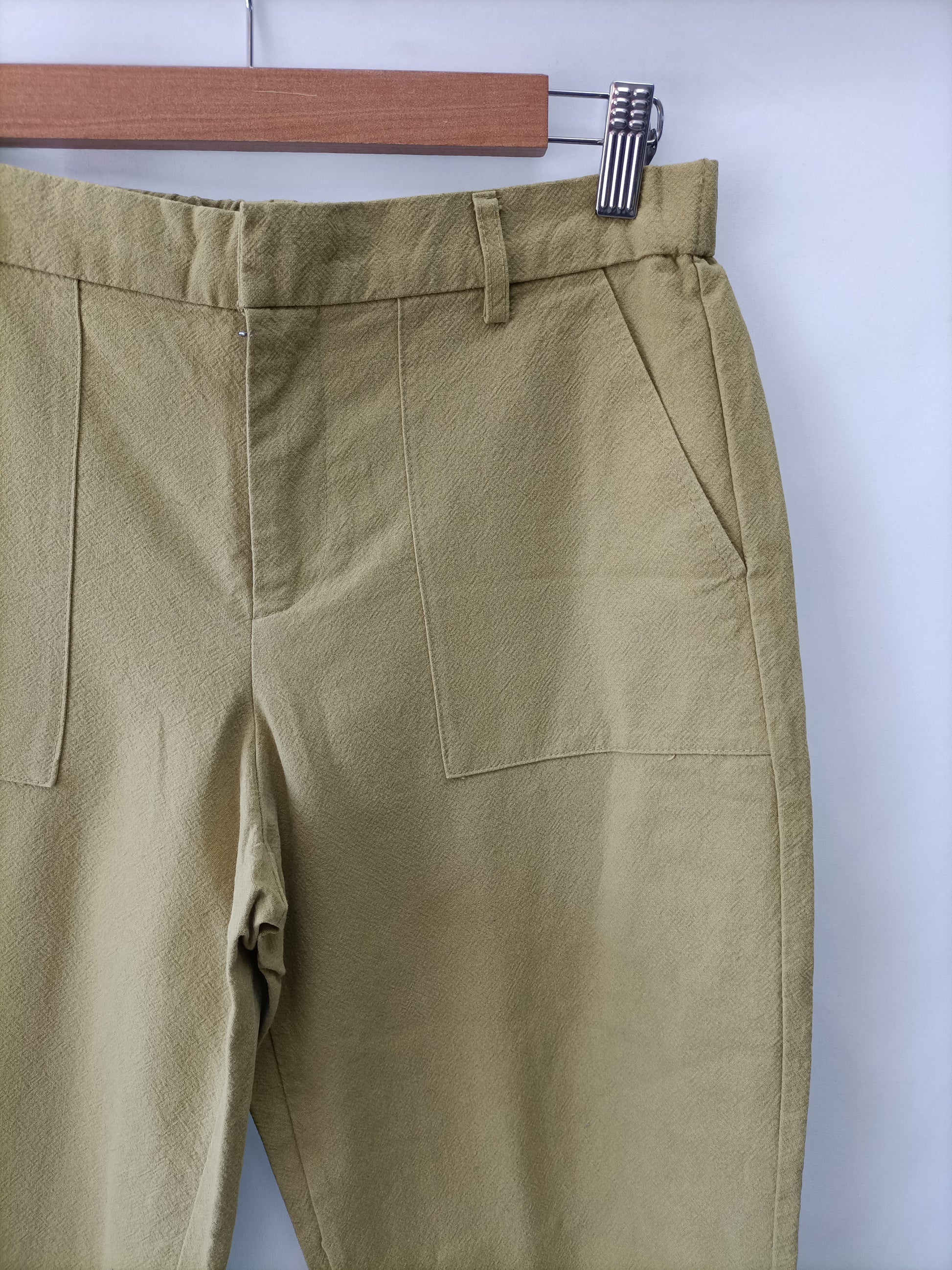 Zara. Pantalón ancho verde pistacho con cintura elástica y tejido semiimpermeable. Largo 97 cm