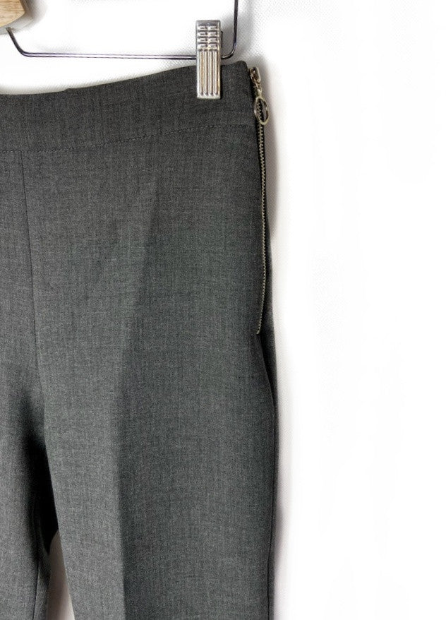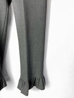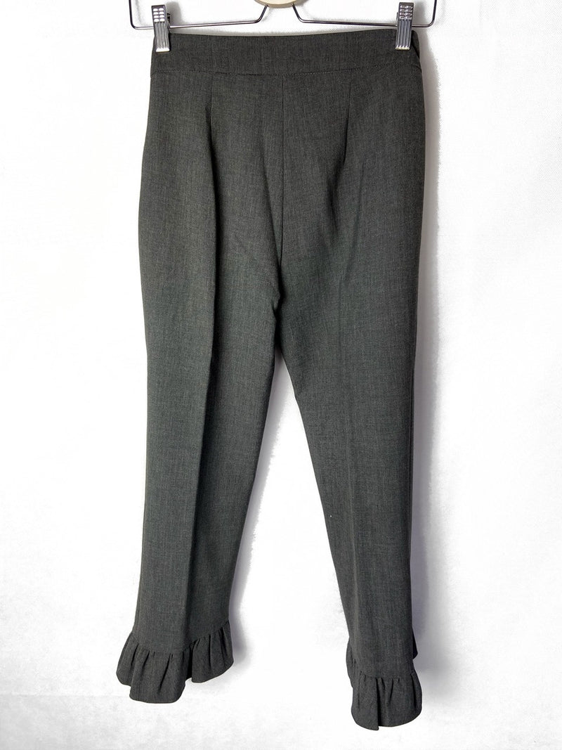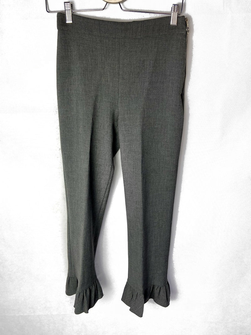 Pantalón de vestir gris ajustado con la parte de abajo con volante. Se abrocha con cremallera lateral y son elásticos