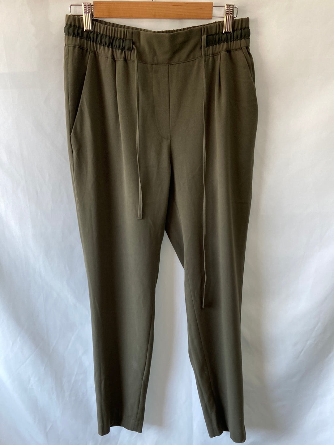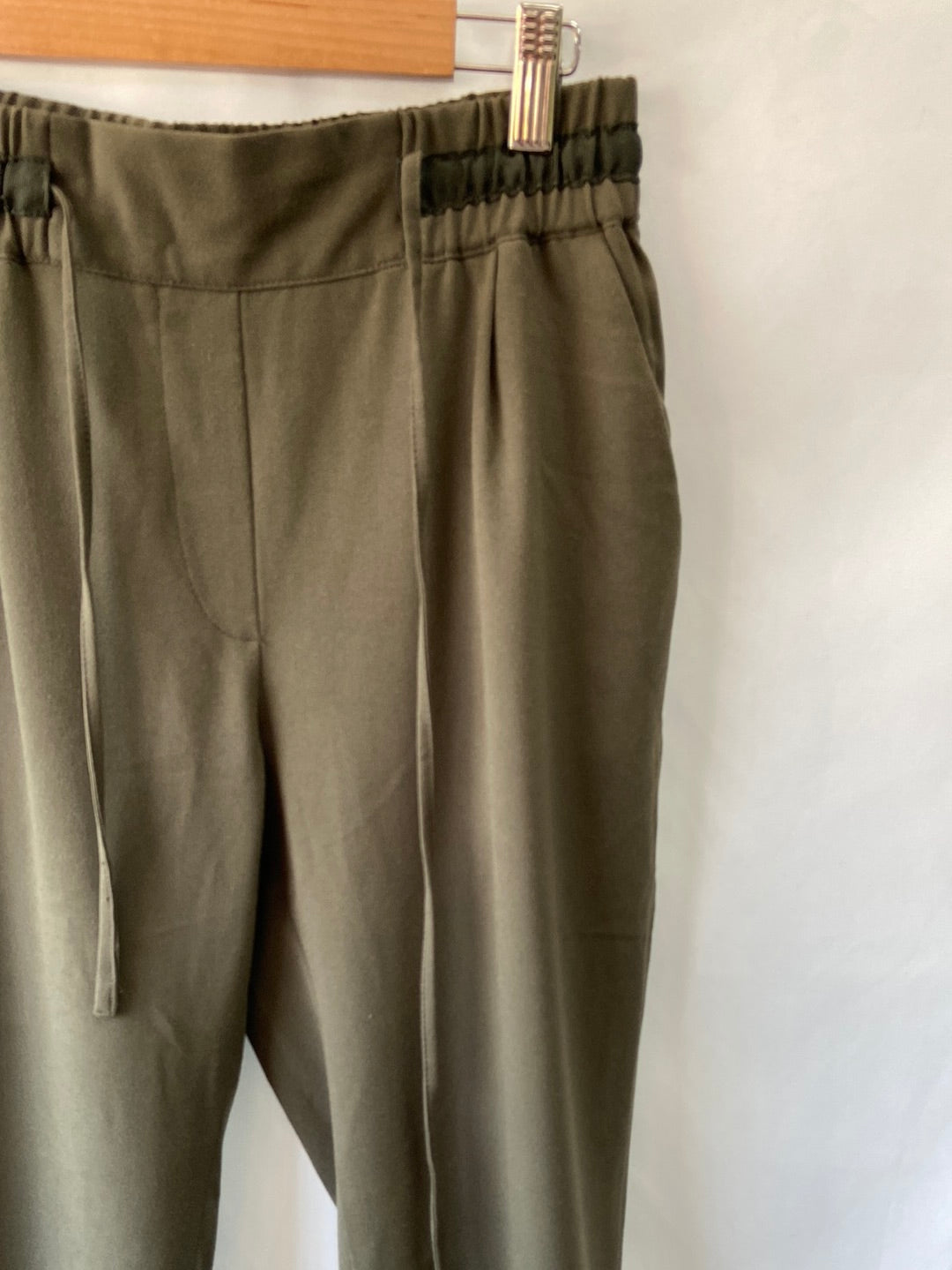 Pantalones verde cacería de estilo fluido y con las cintura elástica. En la cintura tiene una tira verde más oscura.