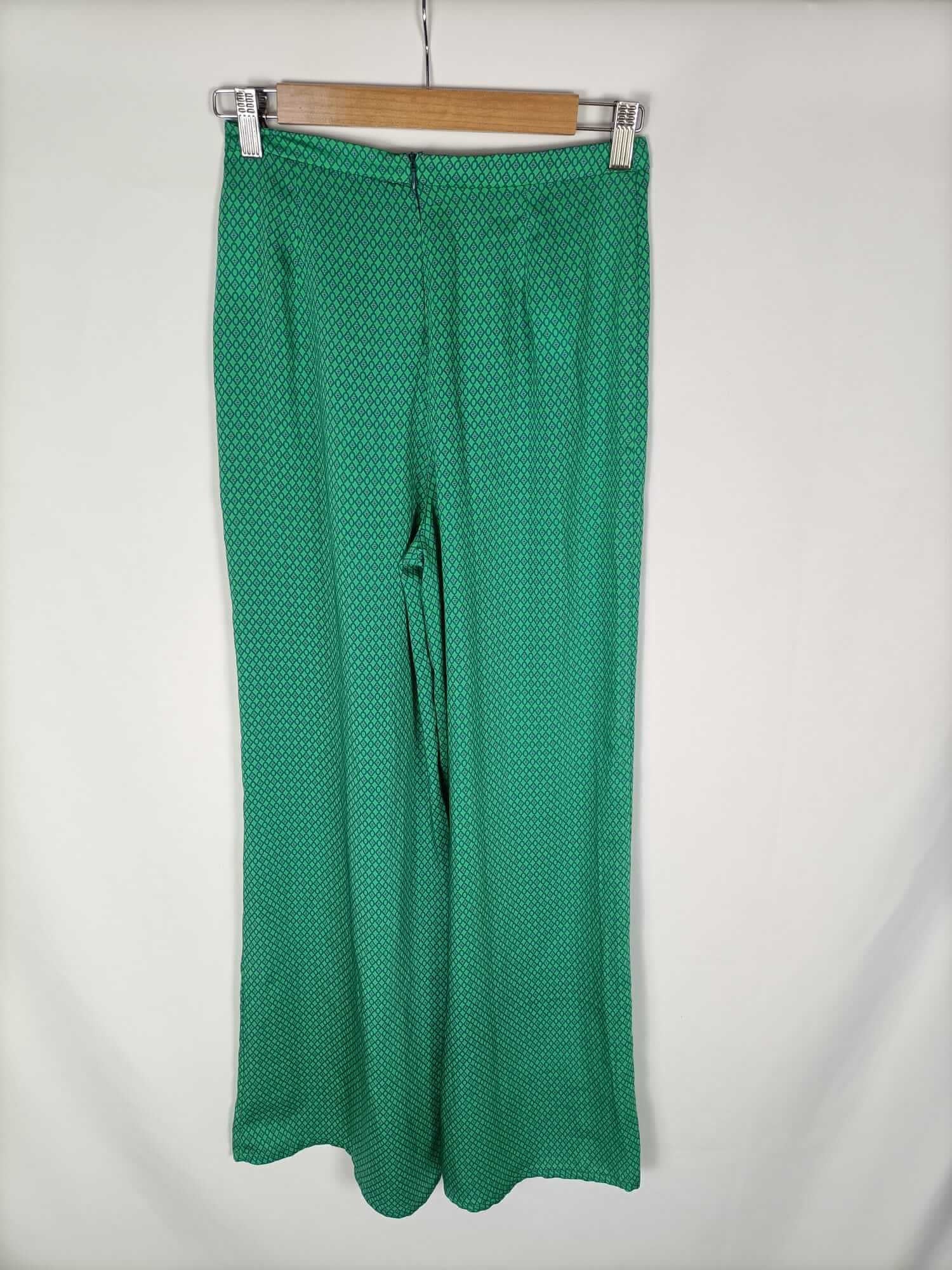 Pantalones de vestir verdes con dibujos geométricos en azul. Es de pata de elefante y ajustado en la cintura. Parte delantera pinzas para dar forma. Se abrochan con cremallera trasera