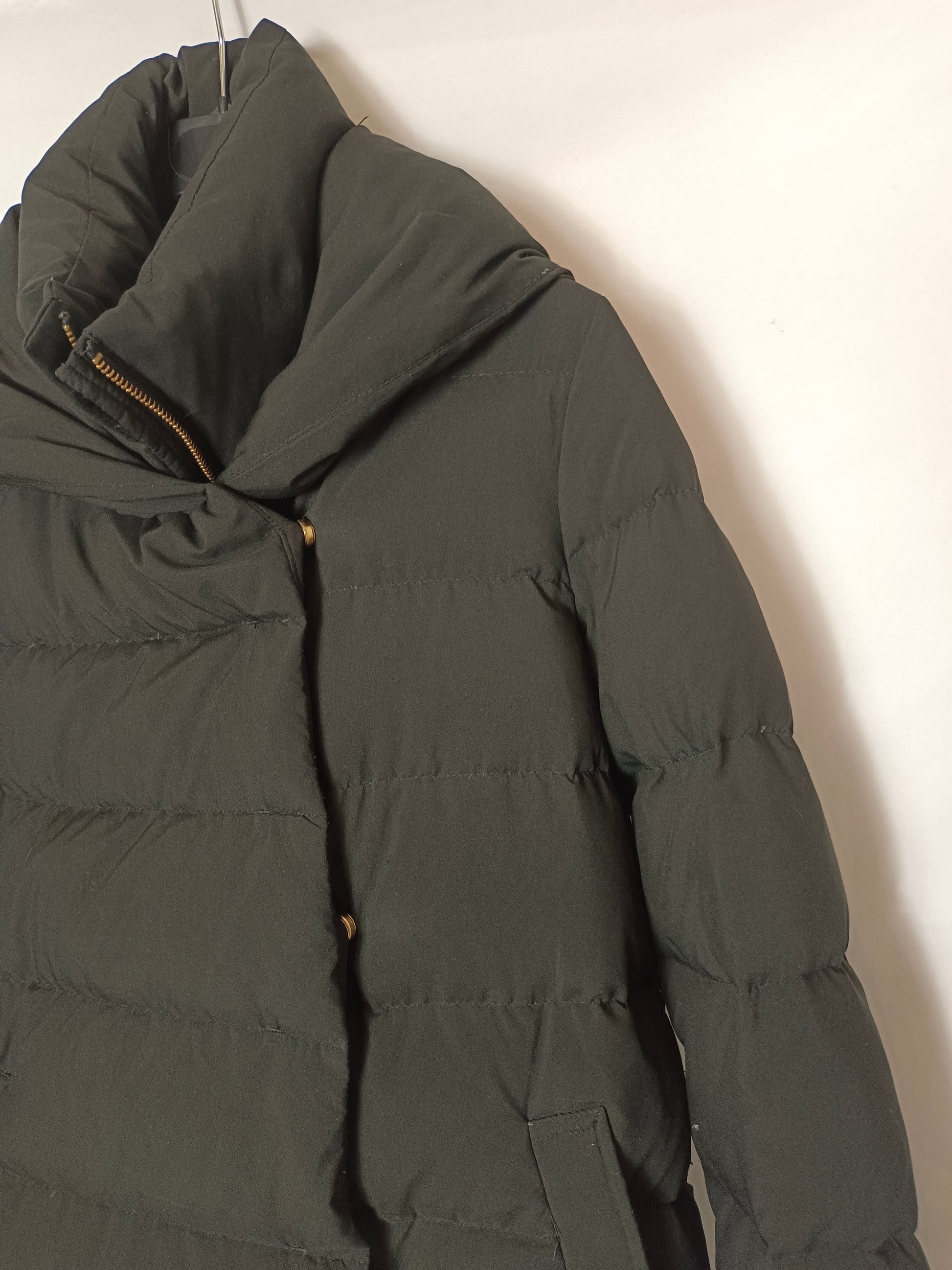 Plumas negro cruzado con capucha. Tiene cremallera y botones cruzados