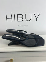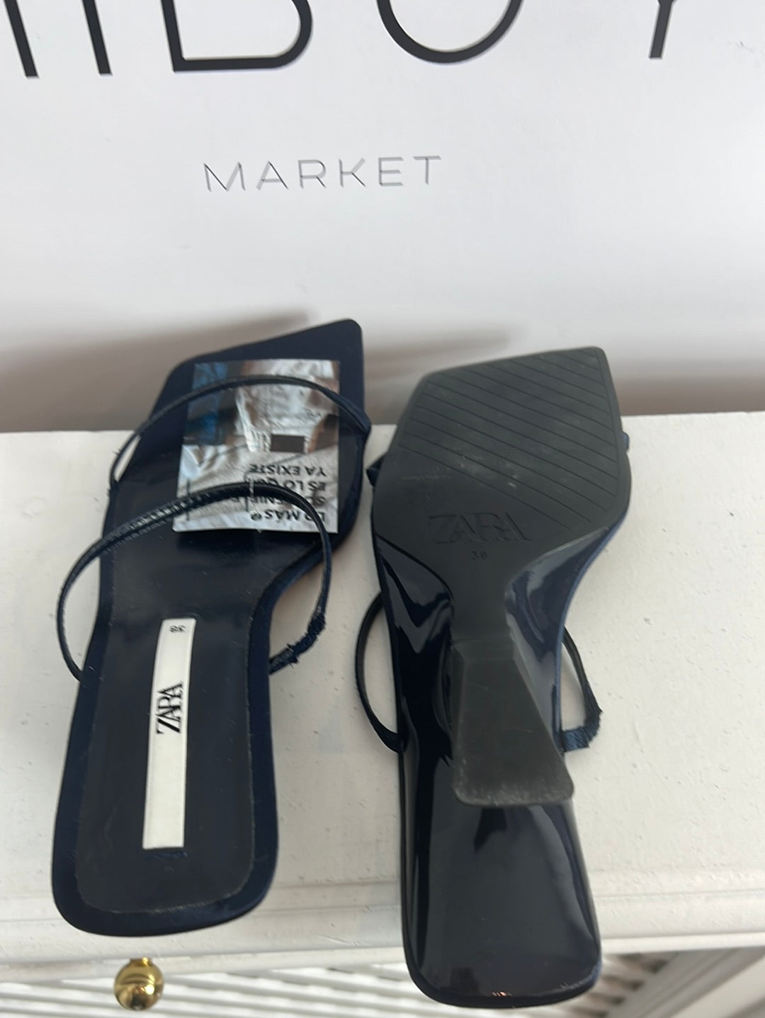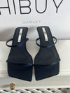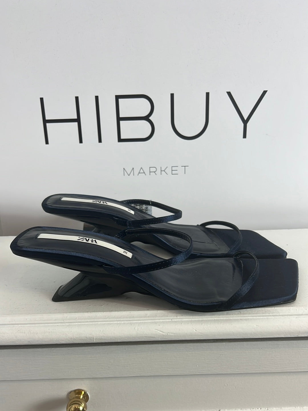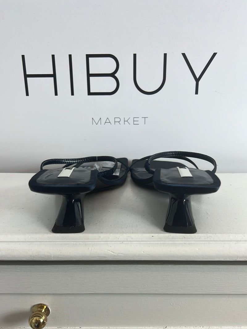 ZARA. Sandalia azul satinada tacón diseño. T 38