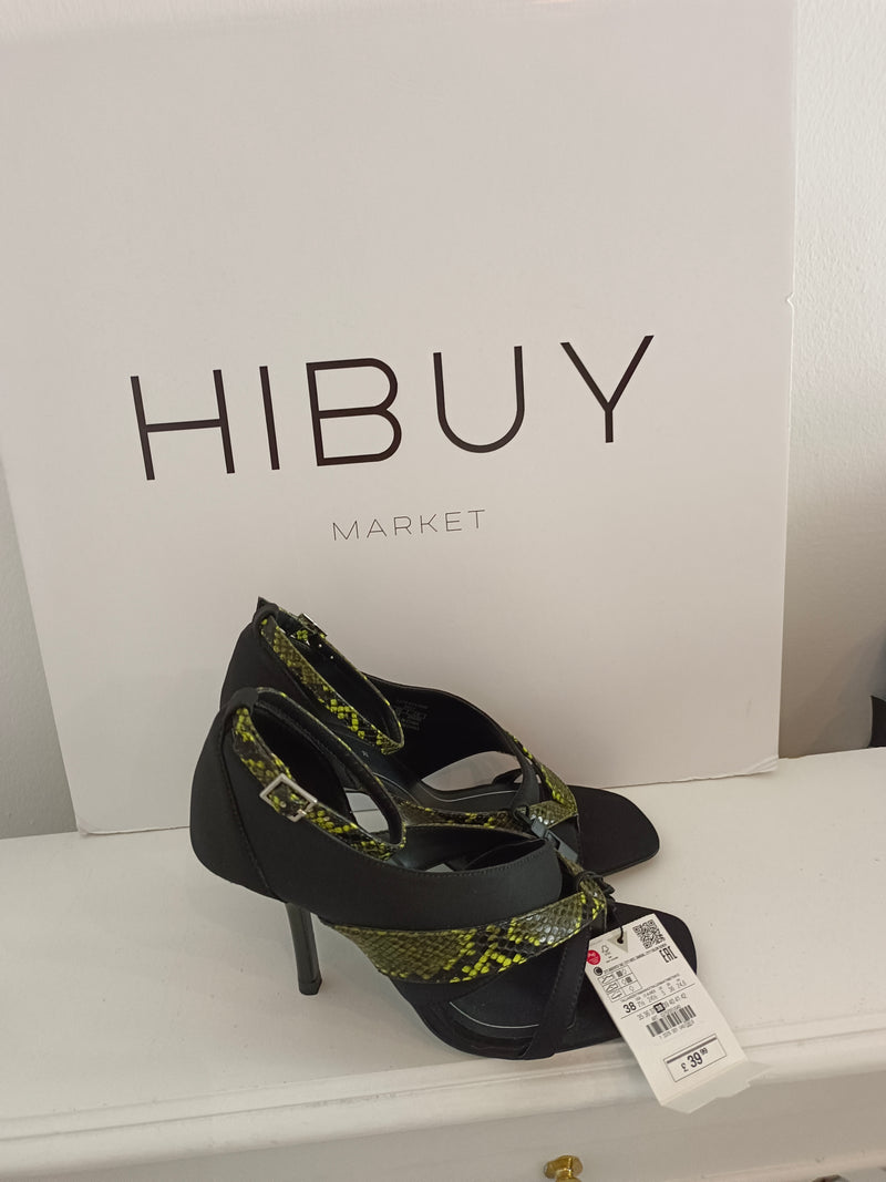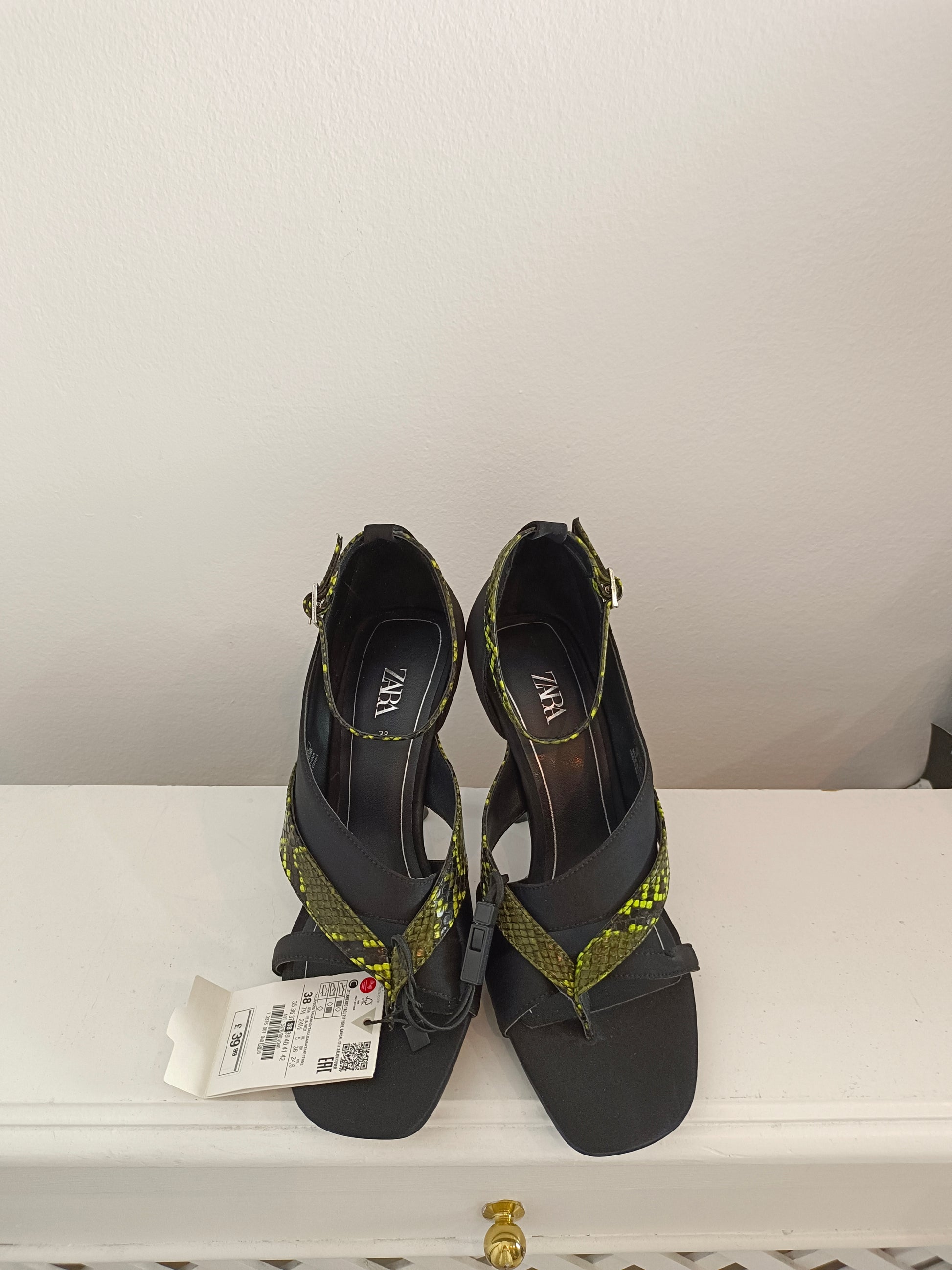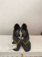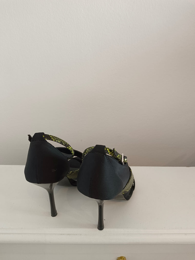 NUEVO CON ETIQUETA. Sandalia negra raso con detalles print fluor.