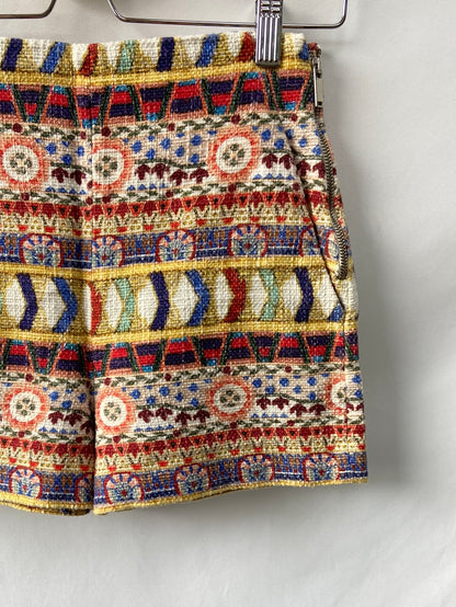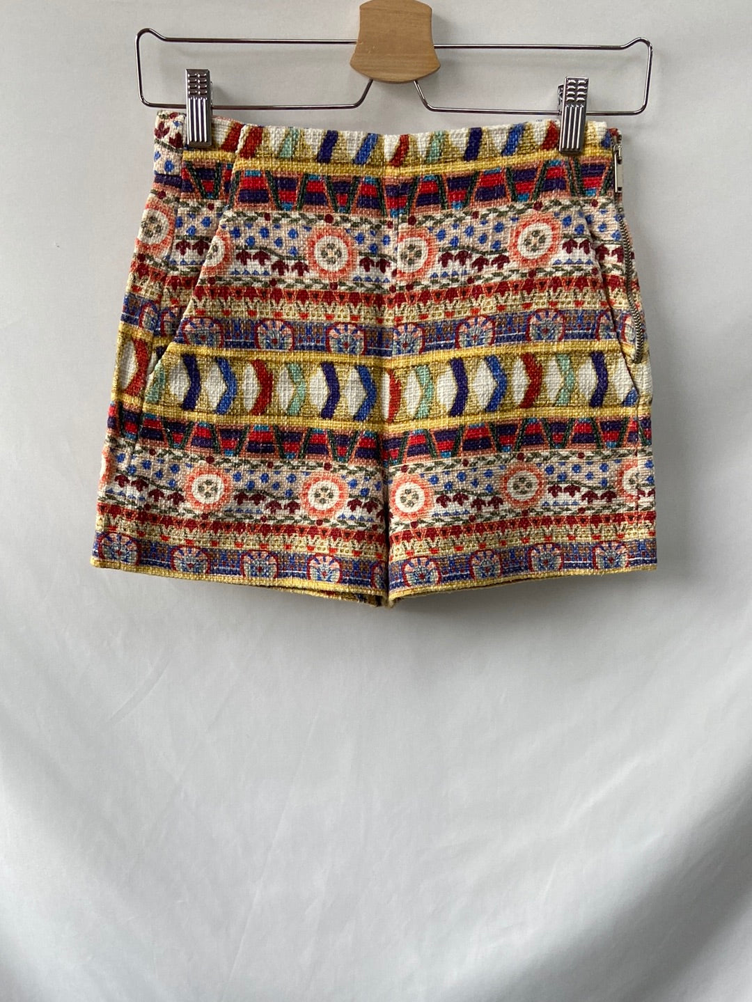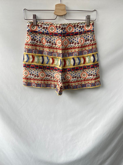 pantalones cortos tejido bordado geométrico estilo étnico. no elasticos con cremallera lateral. cintura 34 cm y largo 33 cm. tiene bolsillos