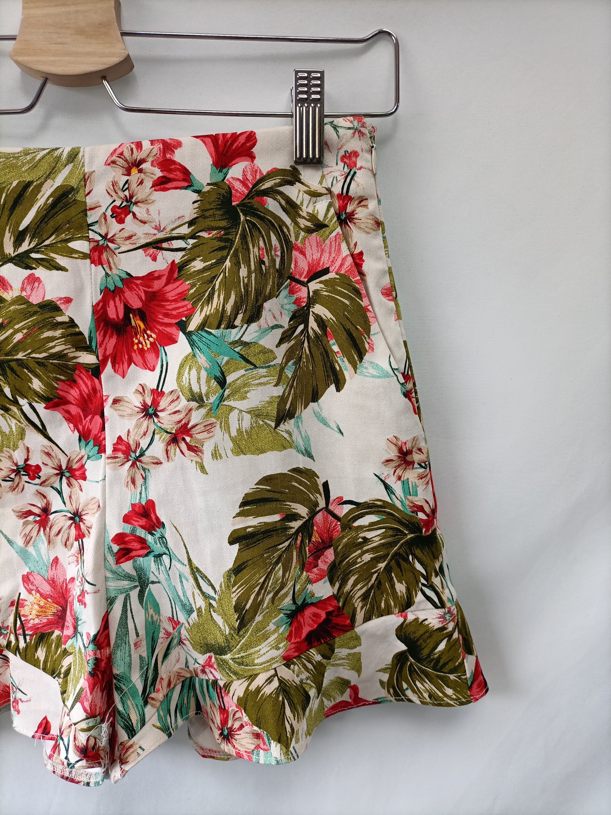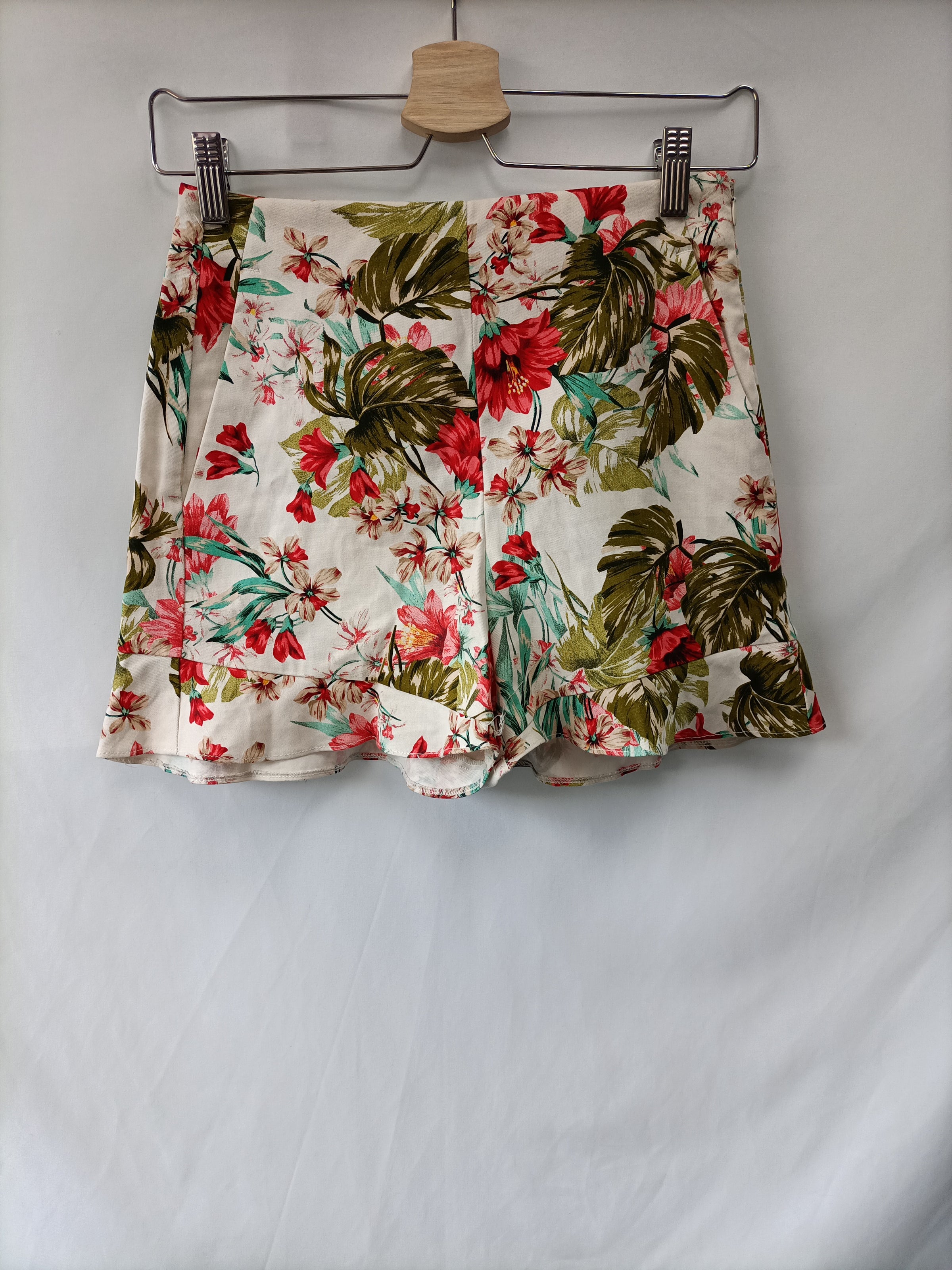 Shorts ajustado de flores de cintura alta con cremallera lateral. Tiene un pequeño volante abajo. No es elástico. Cintura 34 cm largo 36 cm