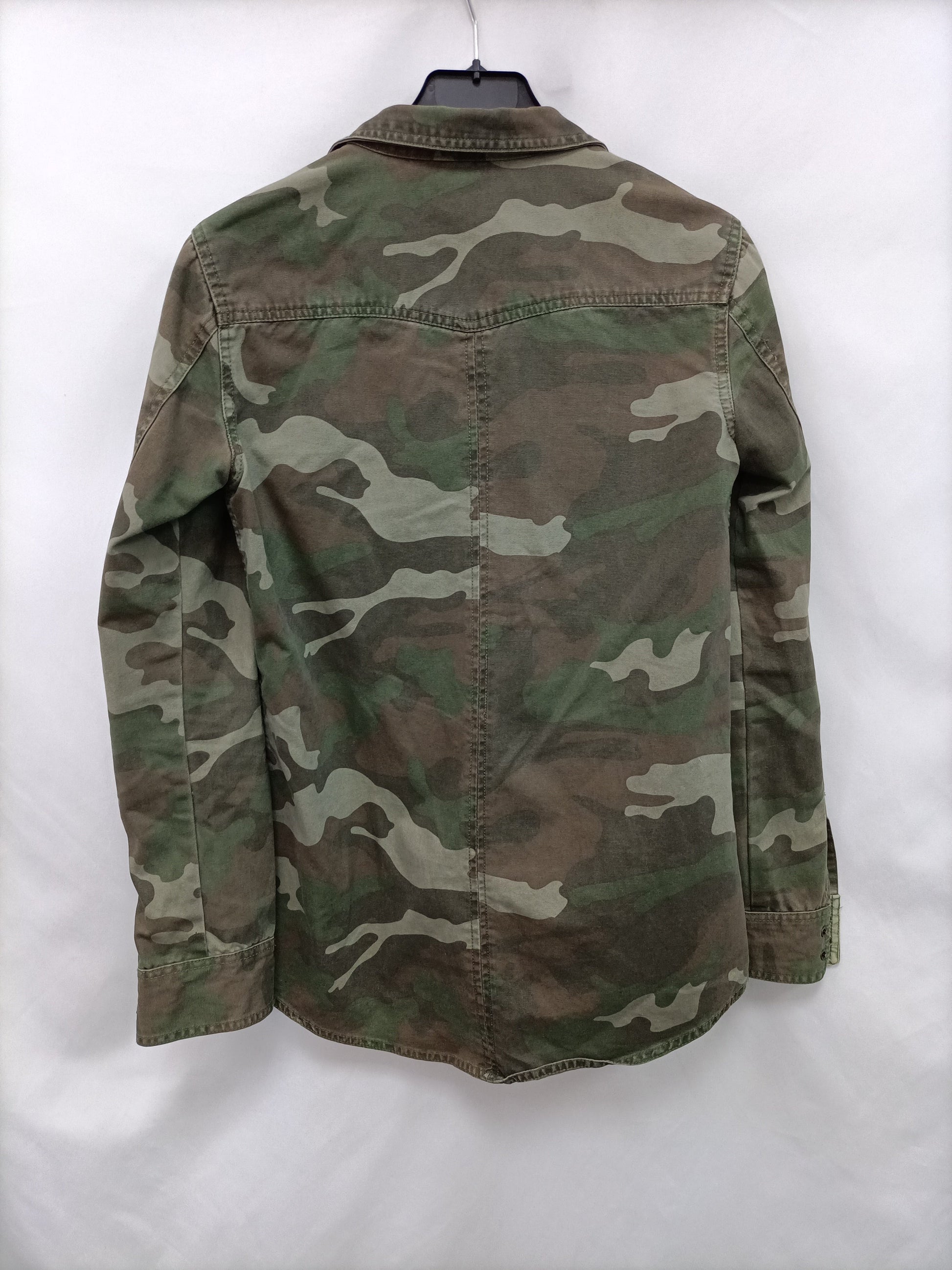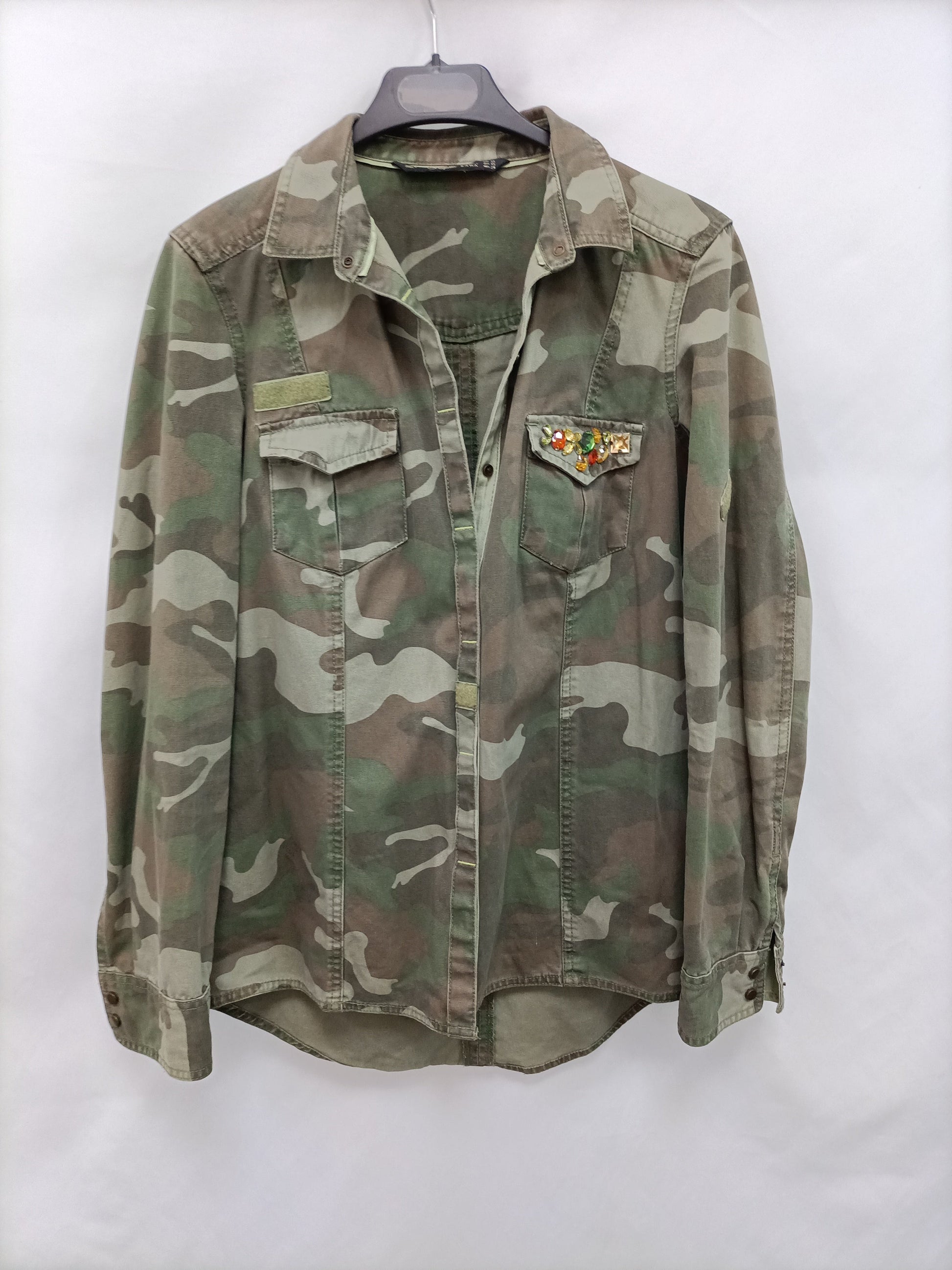 Sobrecamisa/chaqueta verde de camuflaje con abalorios en un bolsillo. No elástico. De sisa a sisa 44 cm largo 74 cm
