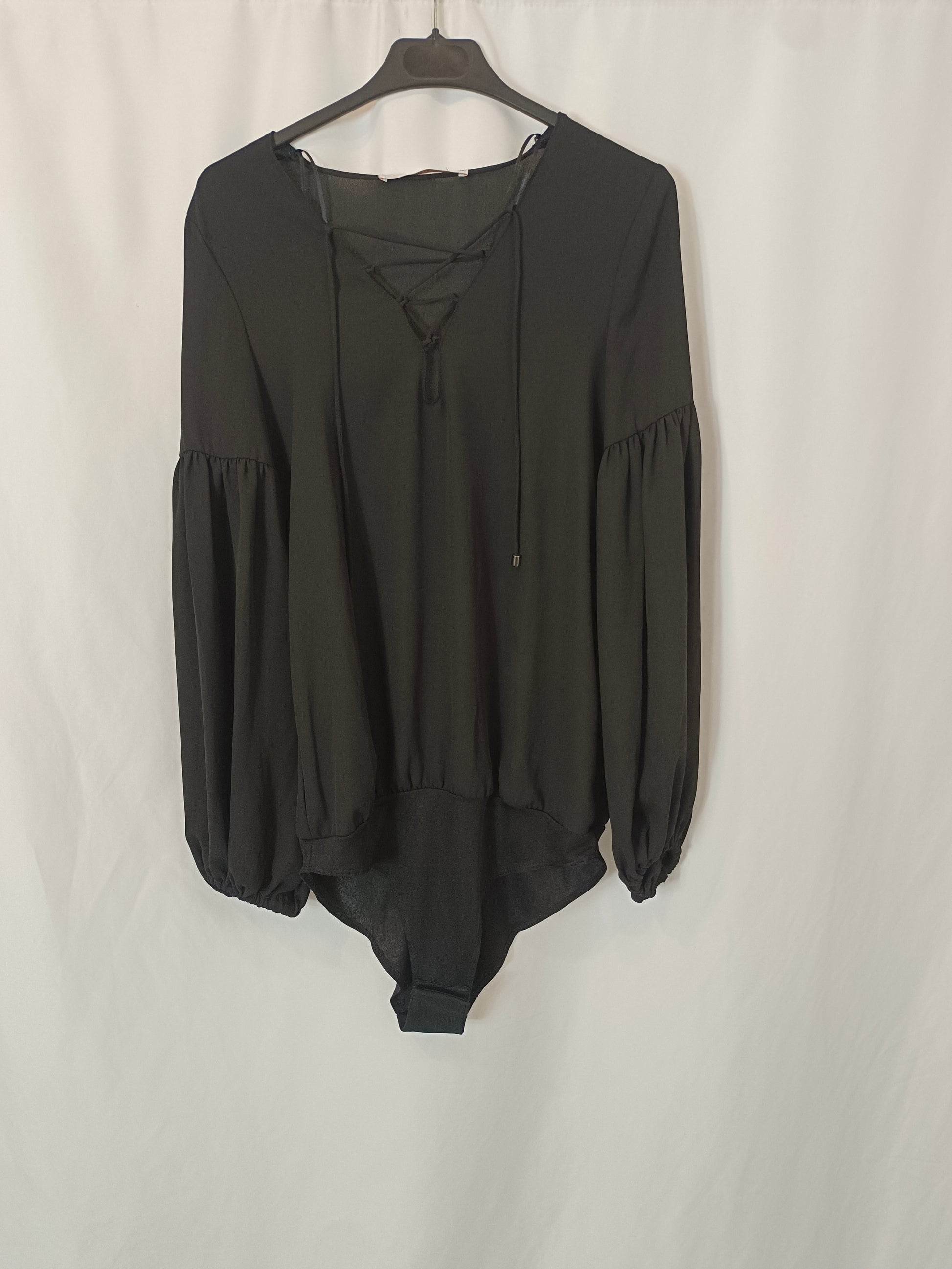 body negro con detalle de cuerda en el escote y mangas ligeramente abullonadas .
