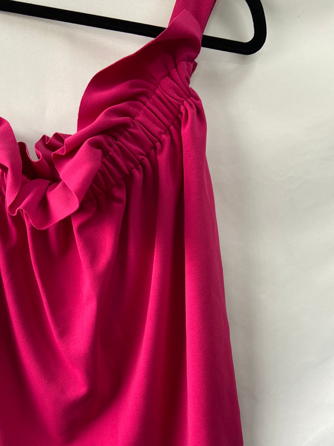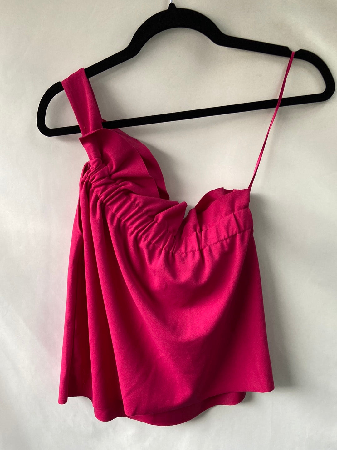 top asimétrico color rosa/buganvilla con volante y elástico en el escote .