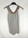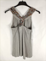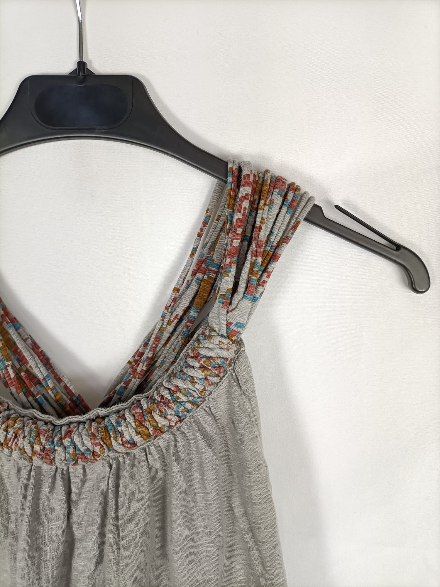 Zara. M . Camiseta gris topo elástica con tirantes de tiras en colores y cruzados por la espalda. Elástico. largo 68 cm