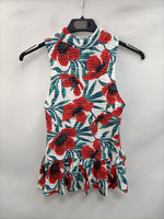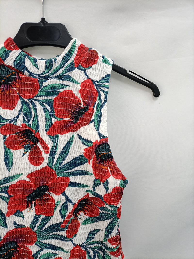 Top fruncido acabado en volante. Blanco con flores rojas y hojas verdes. Cuello tortuga. Hombros al aire. Largo 53 cm