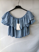 Top fluido de tejido vaquero con escote barco con volante y elástico para que se ajuste. NUEVO CON ETIQUETA