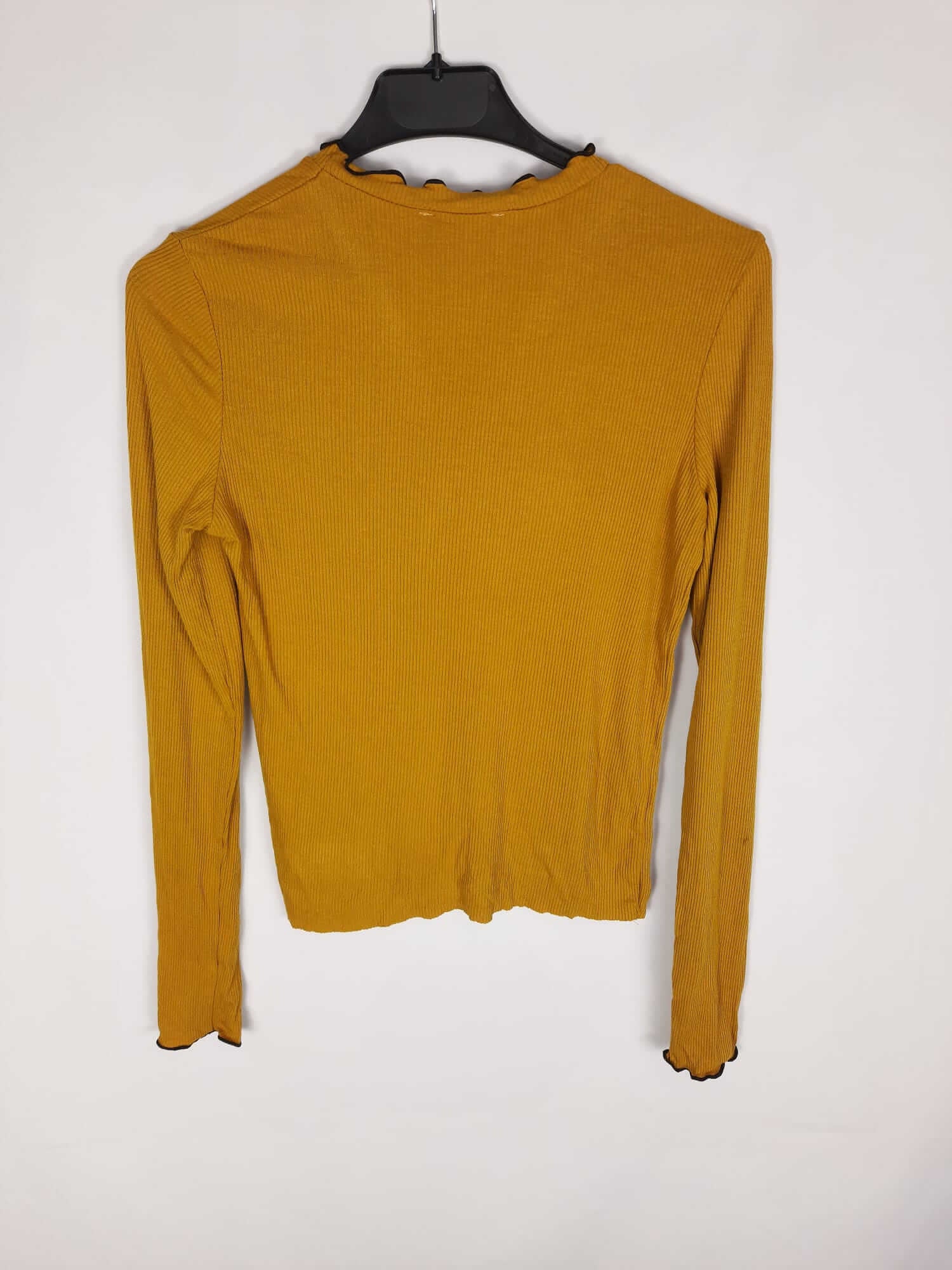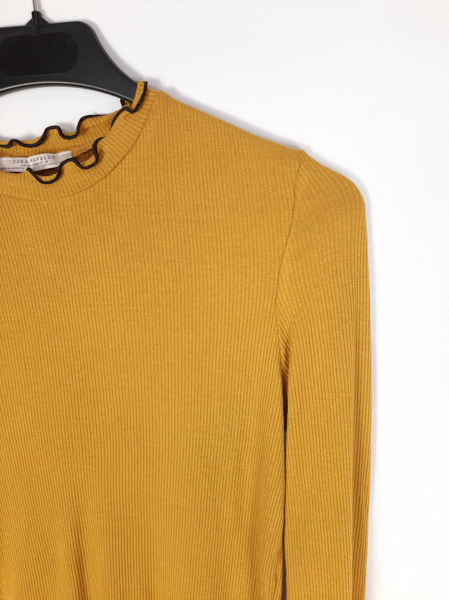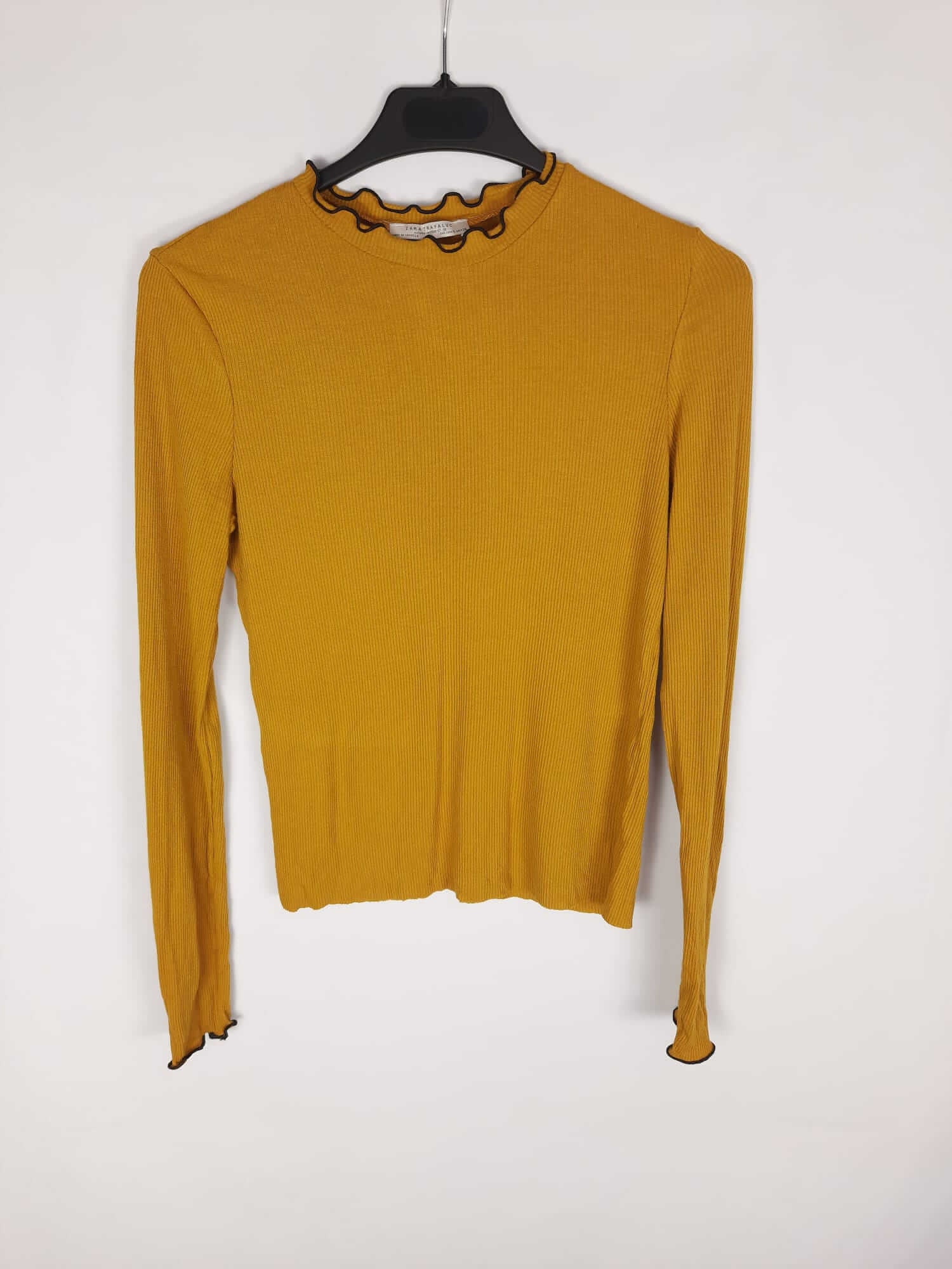 Zara. Top mostaza de punto de canalé con borde negro. Elástico. Largo 52 cm