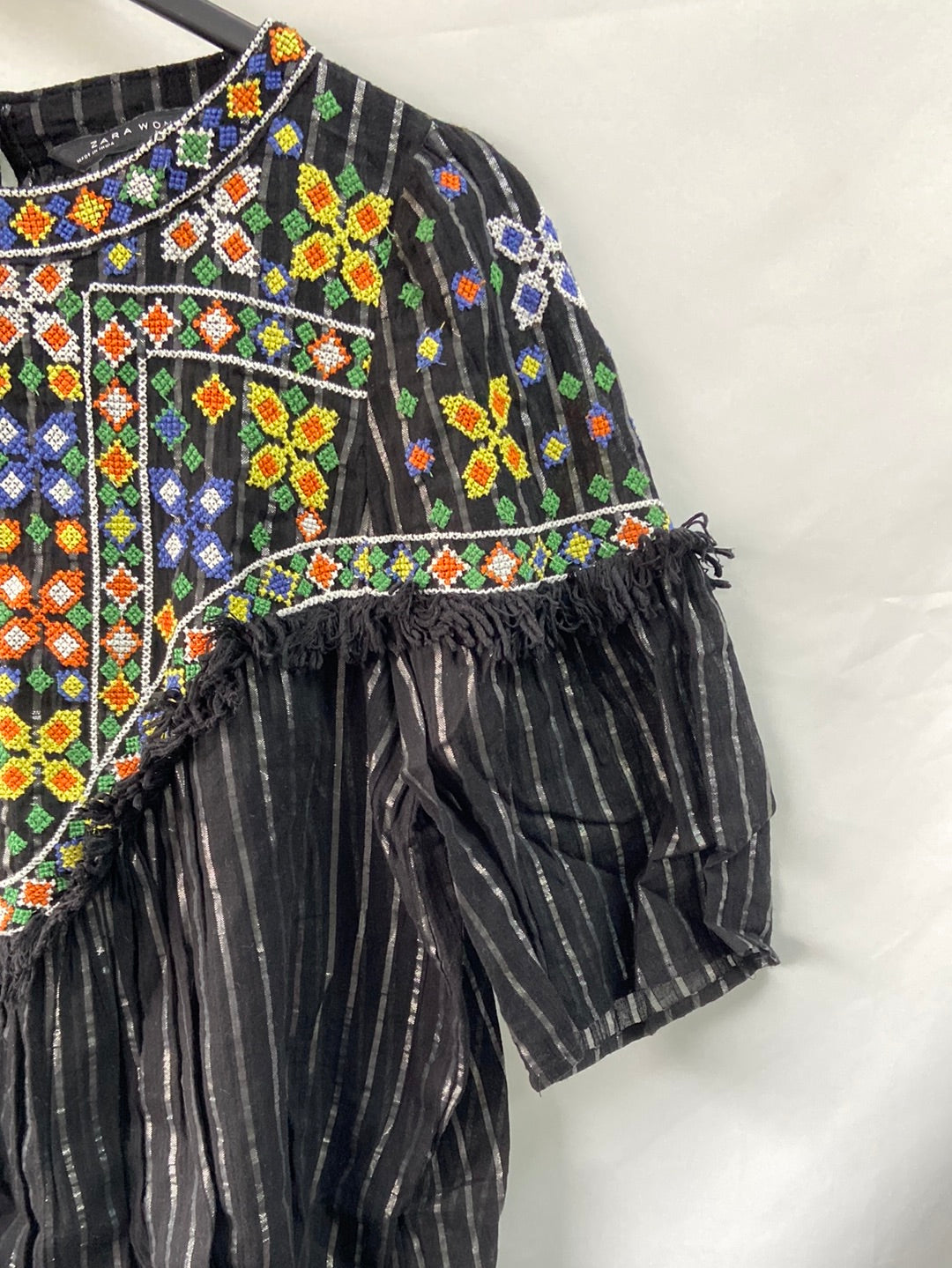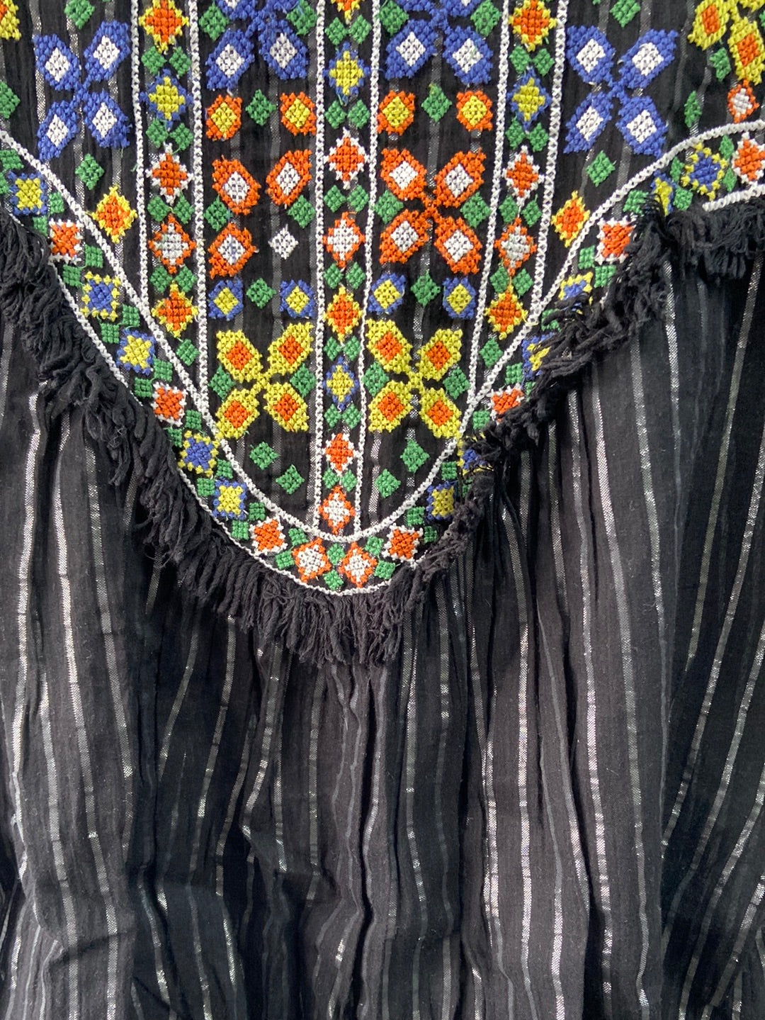 blusa/top negro con rayas plateadas y toda la zona del escote y hombros bordada con detalle de flecos. Es algo oversized (no es ceñida). Y no es elástica