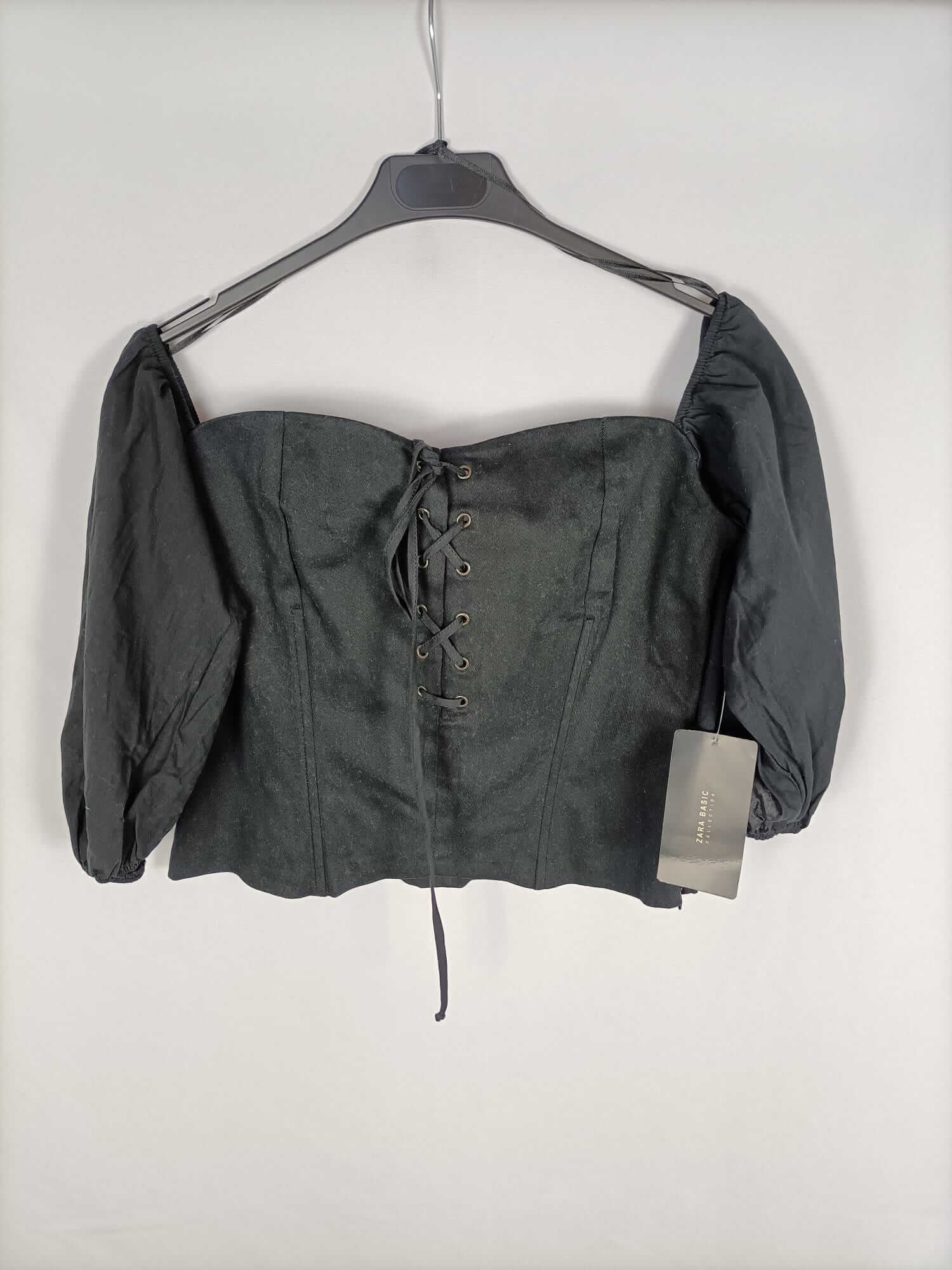 Zara. L. NUEVO CON ETIQUETA. Top negro estilo corsé con cuerdas en el escote y las mangas abullonadas. No elástico. De sisa a sisa 31 cm largo 44 cm. 25,95