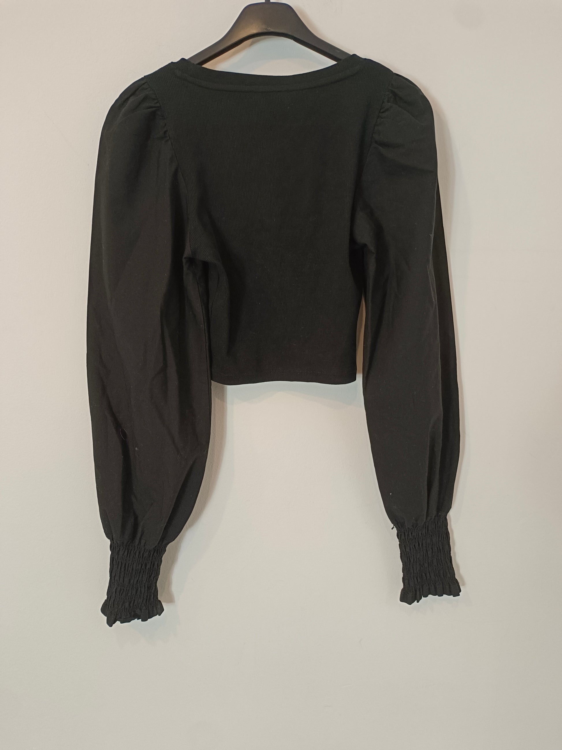 top negro corto con cuerpo elástico de canalé y mangas tejido blusa ligeramente abullonadas