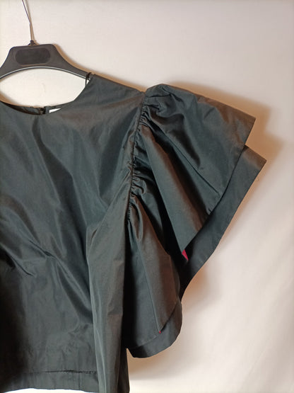 Top negro volantes con interior en rosa y rojo. Tejido no elástico y cremallera en la espalda. De sisa a sisa 43 cm