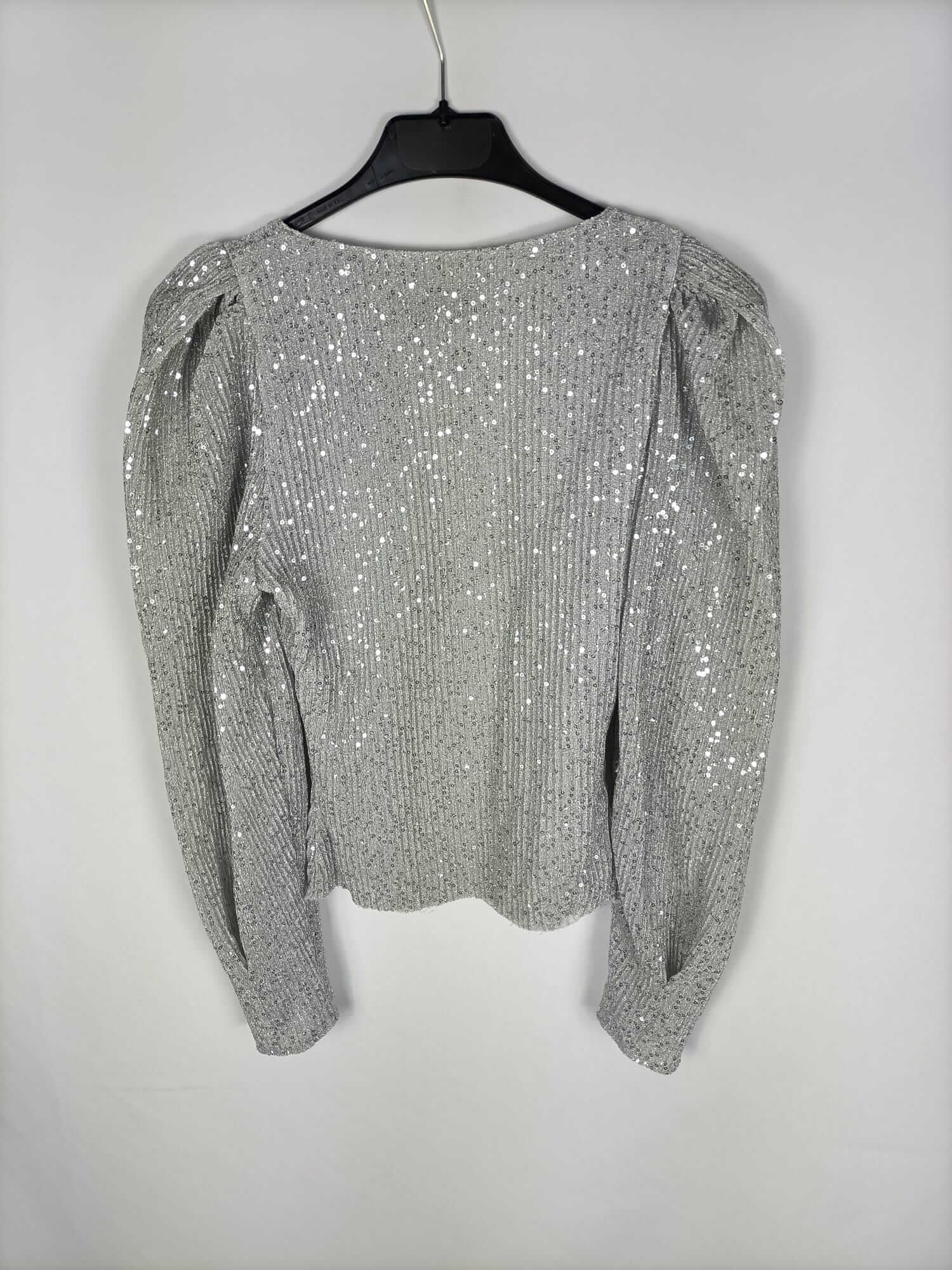 Zara. Xs. Top plateado con lentejuelas y las mangas abullonadas. Elástico. Largo 50 cm
